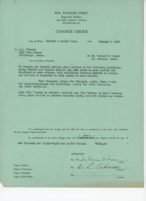 Change Order instructing Leo Pitassi to furnish windows for transepts, choir loft, vestibules, baptistry, and sacristies at St. Bernard Church, Mt. Lebanon, PA.Collection
