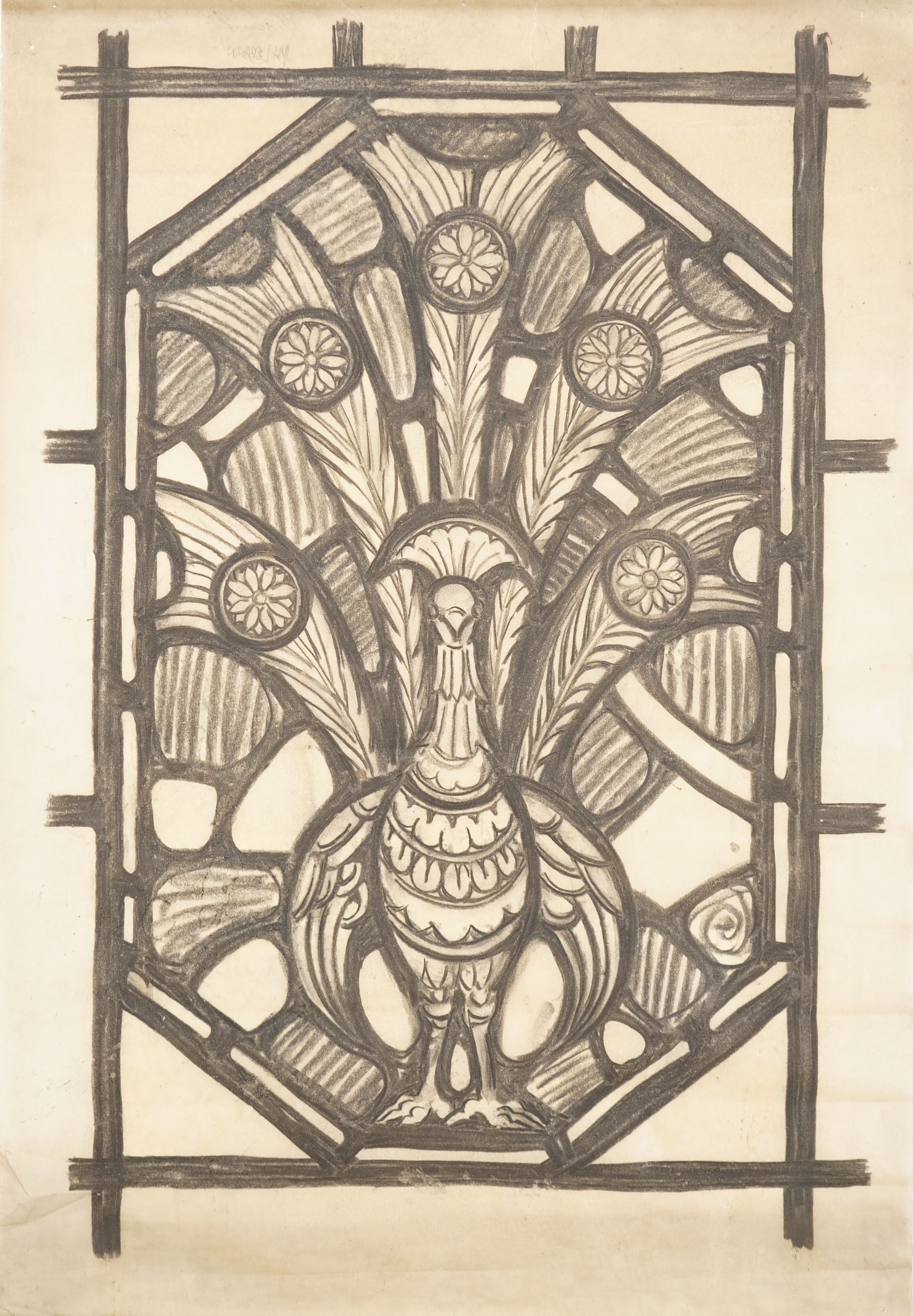 Stained glass scale cartoon, medallion for window in Clairvaux Hall inside St. Bernard's Church, Mt. Lebanon, Pittsburgh, Pennsylvania. Depicts a peacock. See "St. Bernard Church, Mt. Lebanon, Pennsylvania" by Rev. Thomas R. Wilson for more information.Type of Drawing