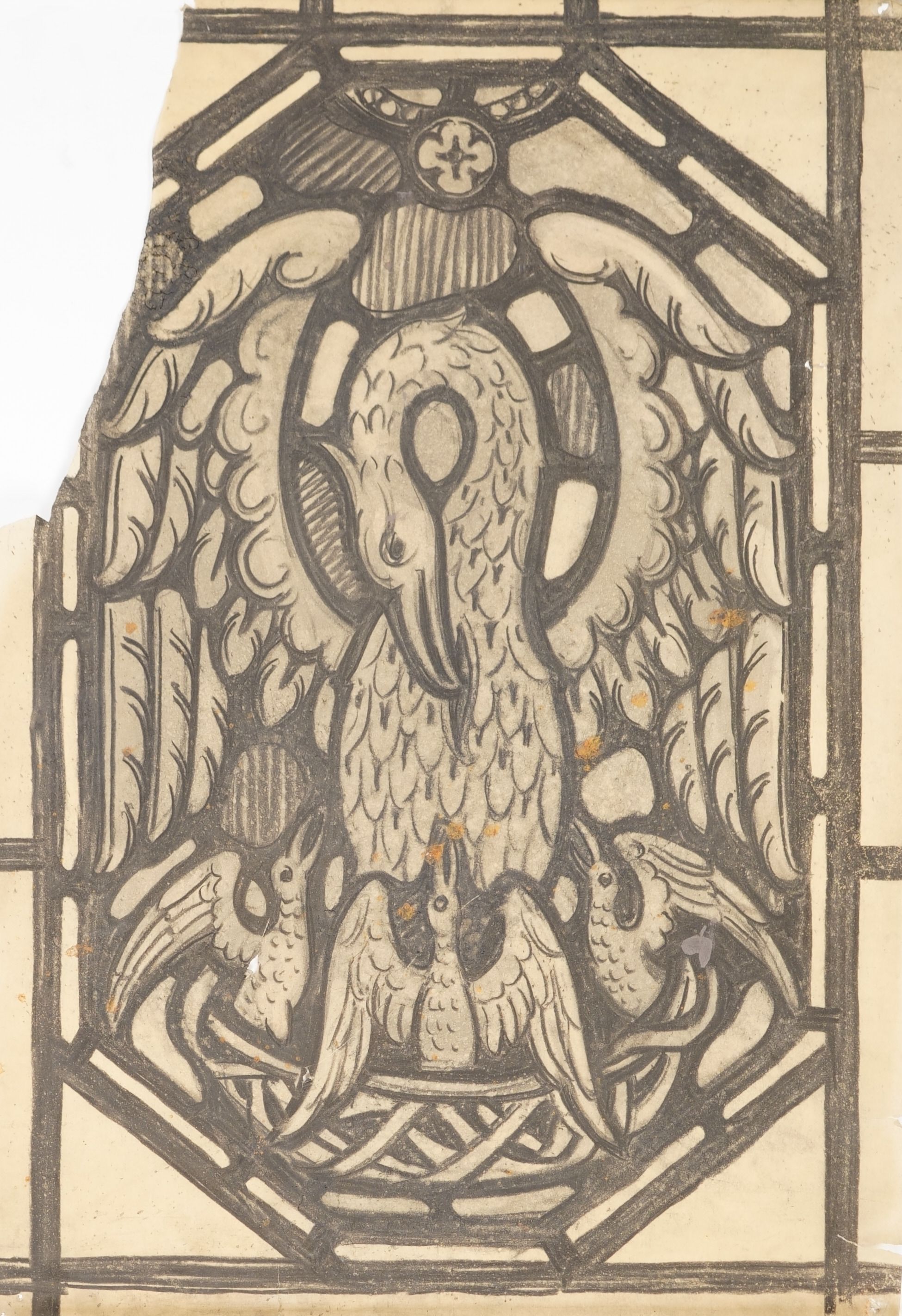 Stained glass scale cartoon, medallion for window in Clairvaux Hall inside St. Bernard's Church, Mt. Lebanon, Pittsburgh, Pennsylvania. Depicts a pelican, representing Christ's sacrifice. See "St. Bernard Church, Mt. Lebanon, Pennsylvania" by Rev. Thomas R. Wilson for more information.Collection