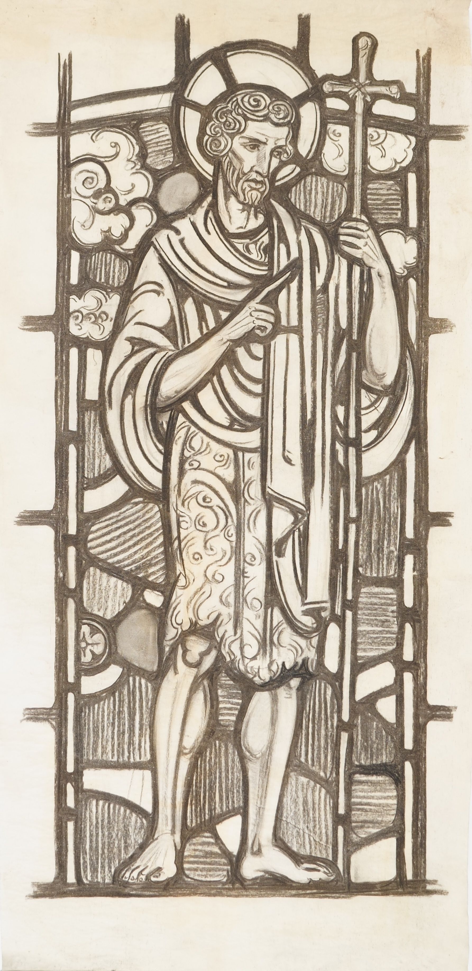 Stained glass scale cartoon, medallion for window in Clairvaux Hall inside St. Bernard's Church, Mt. Lebanon, Pittsburgh, Pennsylvania. Depicts St. John the Baptist dressed in furs with a cross staff. See "St. Bernard Church, Mt. Lebanon, Pennsylvania" by Rev. Thomas R. Wilson for more information.Type of Drawing