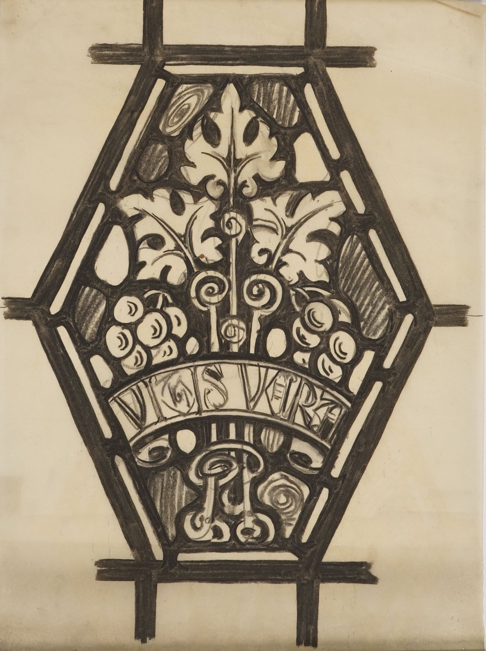 Stained glass scale cartoon, medallion for priest sacristy window in Clairvaux Hall inside St. Bernard's Church, Mt. Lebanon, Pittsburgh, Pennsylvania. Depicts grapes with VITIS VERA written on a ribbon. See "St. Bernard Church, Mt. Lebanon, Pennsylvania" by Rev. Thomas R. Wilson for more information.Type of Drawing