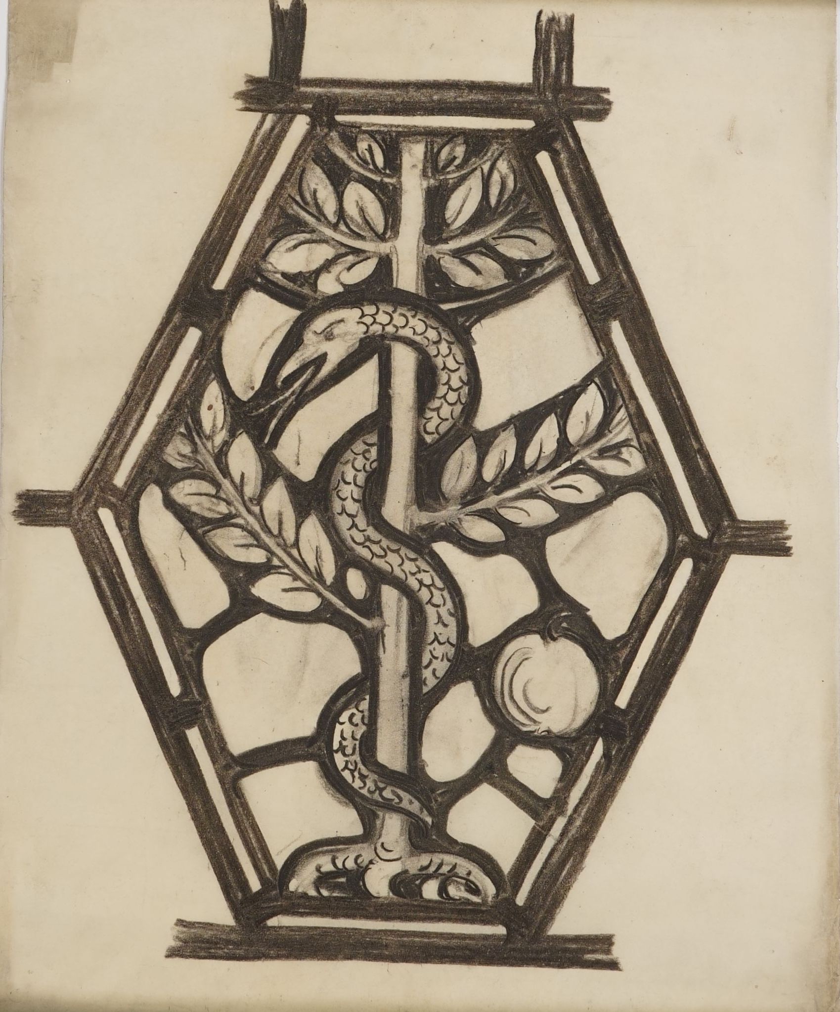 Stained glass scale cartoon, medallion for window in Clairvaux Hall inside St. Bernard's Church, Mt. Lebanon, Pittsburgh, Pennsylvania. Depicts a serpent on a tree next to an apple. See "St. Bernard Church, Mt. Lebanon, Pennsylvania" by Rev. Thomas R. Wilson for more information.Type of Drawing