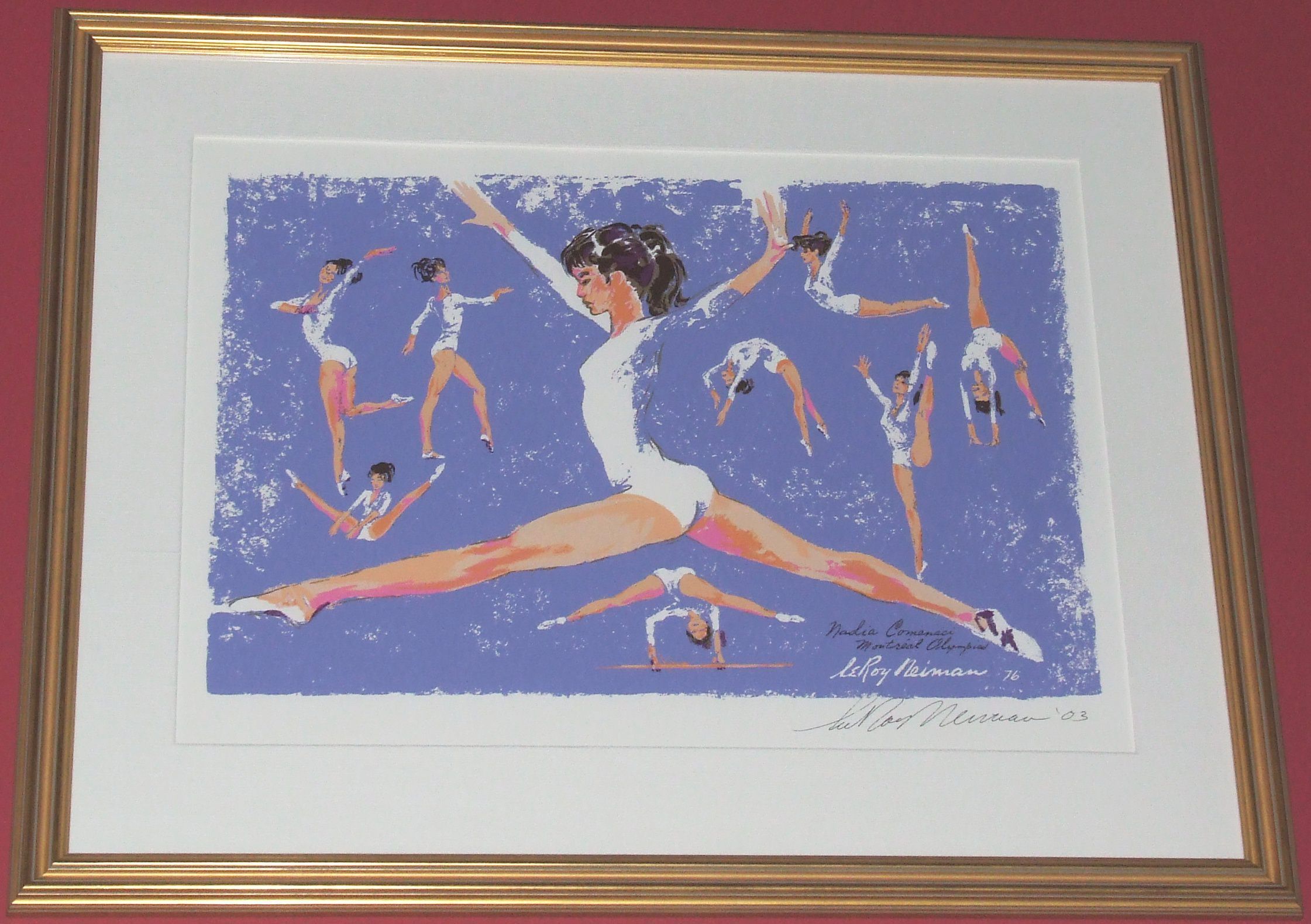 Serigraph of 1976 Romanian Olympic Medalist Nadia Comaneci. The artist, LeRoy Neiman was the ABC TV official artist for the 1976 Montreal Olympic Games. The "Nadia" serigraph began publication in 1976 and was discontinued in the 1990's. This particular print was hand signed by the artist in 2003 for authenticity.Collection