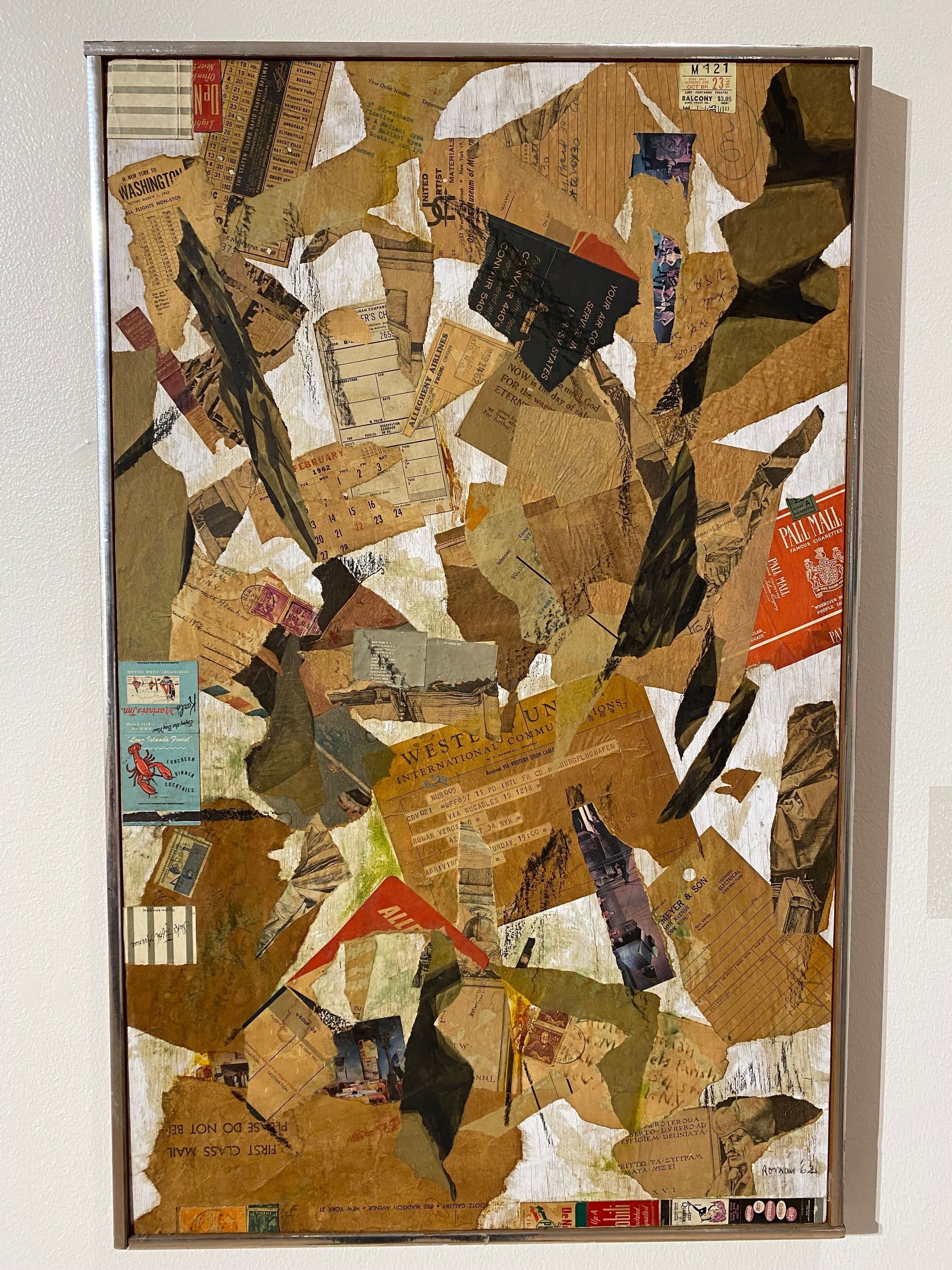 Flight plans, stamps, cuttings from packages and envelopes, advertisements for cafes and restaurants, and other paper ephemera record Verostko’s experiences in New York City, providing a glimpse into the things he was interested in, the places he visited, and the people he talked to. Primarily monochromatic browns and whites, the few splashes of color draw the eye across the canvas.Created By