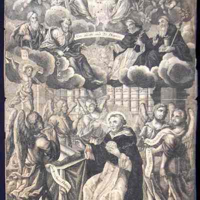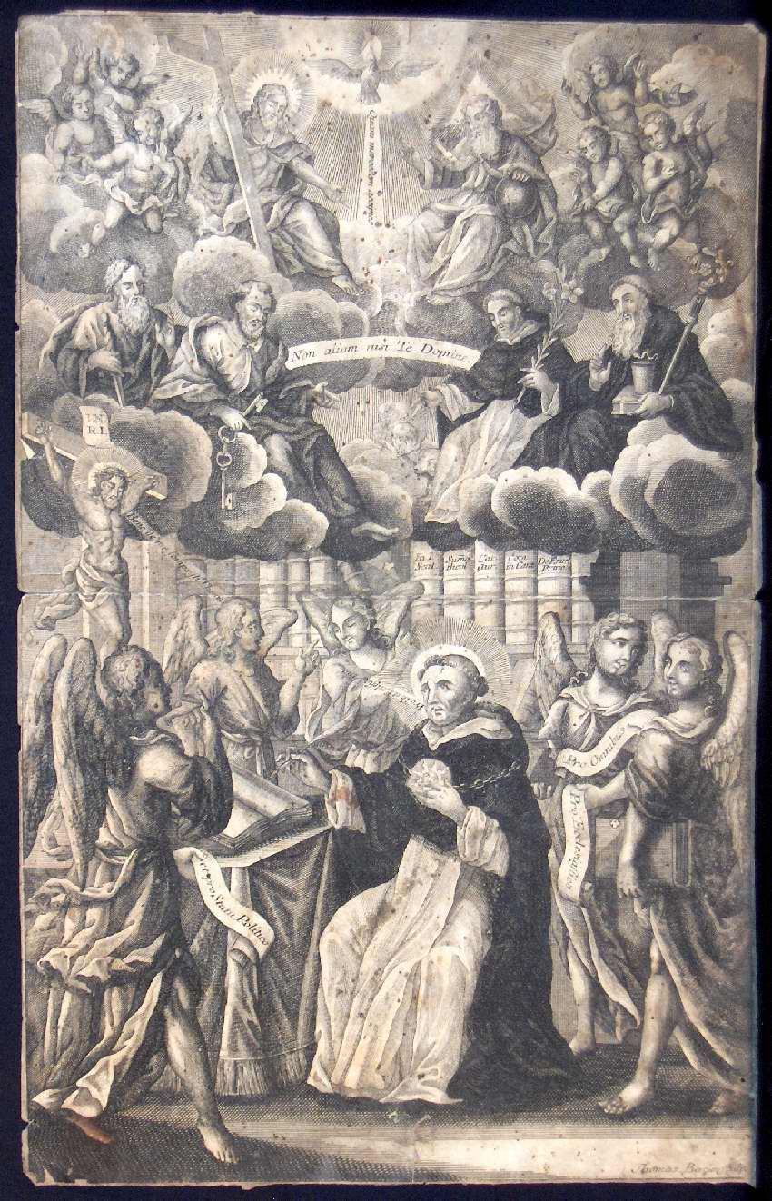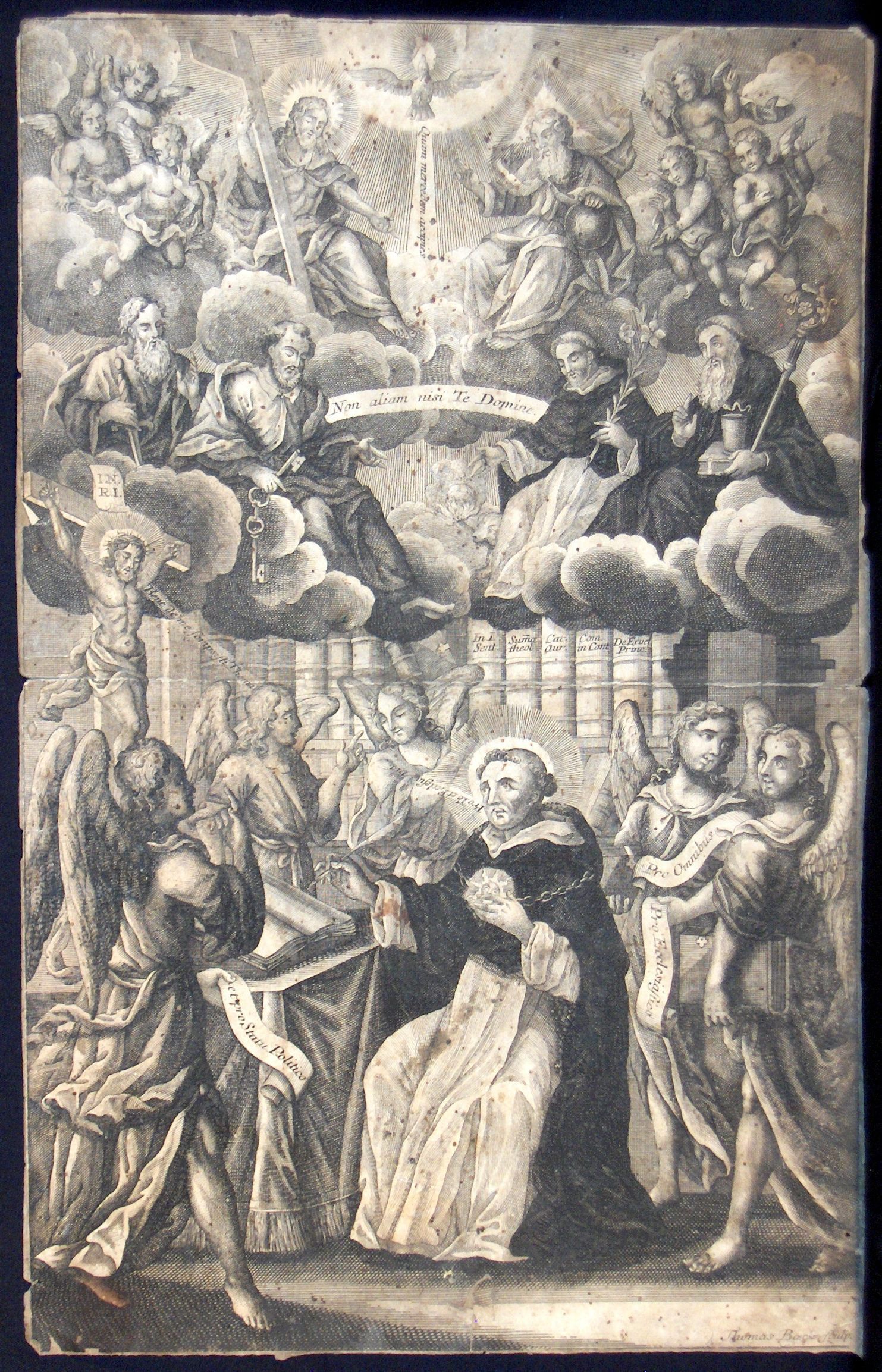 Engraving, Artwork, Ink, Thomas Baeck, Saint Thomas, Angels, Books, Education, Heaven, Holy Spirit, Crucifix, Saints, Library, Thyself Only, Oh Lord, Non Aliam nisi te Domine, Engraving, Artwork, Ink