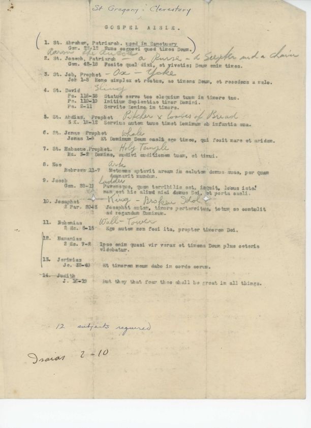 Notes on subjects for the Gospel (left) side aisle windows.Collection