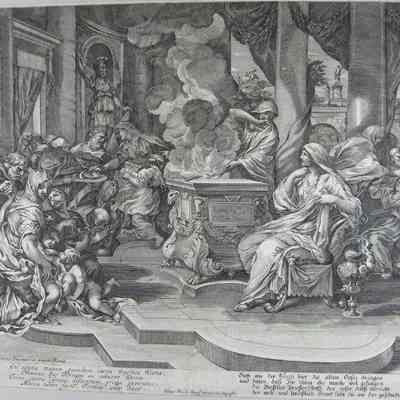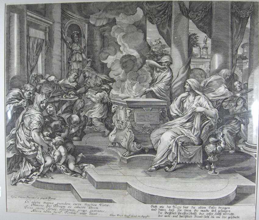 Engraving, Artwork, Ink, Vesta, Offering, Goddess, Hearth and Home, Sacrifice, Temple, Alter, Fire, Smoke, Stapff, Johann Ulrich, Stapff, Johann Ulrich Stapff, Engraving, Artwork, Ink