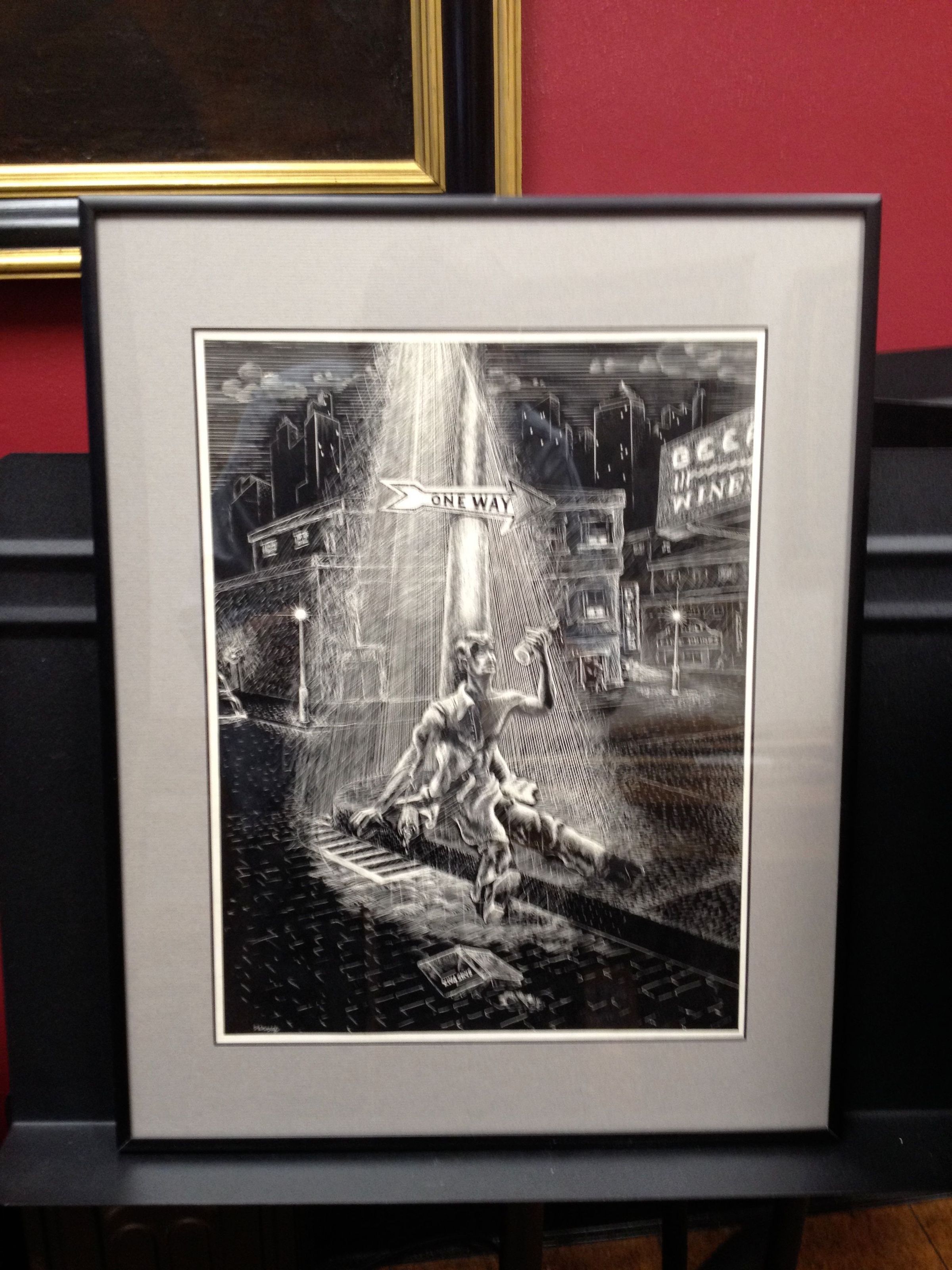 Scratchboard drawing of a man drinking alcohol under a street lamp at night. One of the several moralizing drawings the artist created for his illustration portfolio. This illustration was based on the experiences of an artschool roommate who grew up an orphan, fought as a marine during World War II, experienced nightmares following the war and turned to alcohol.Artwork Details