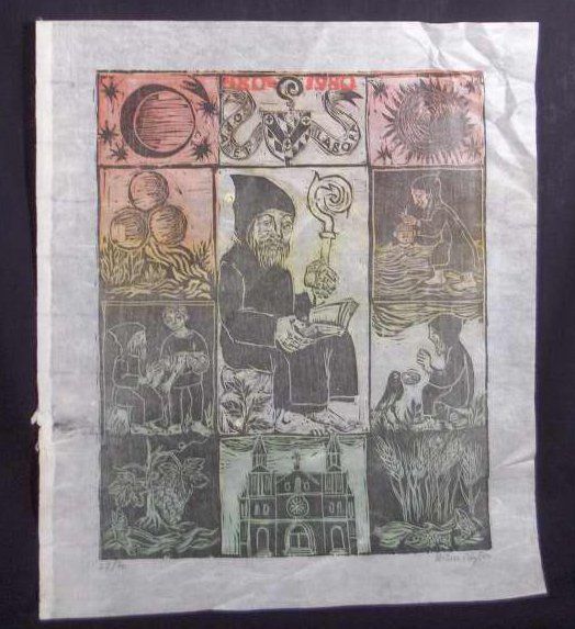 This original print designed and produced by Helen Siegl of Phioladelphia is one of a limited edition of forty. It is printed on Sekishu white, Japanese rice paper and created especially for the Sesquimillenial Observance at the Archabbey (1980). It is our gift to you. The Archabbot and Community (of Saint Vincent Archabbey)