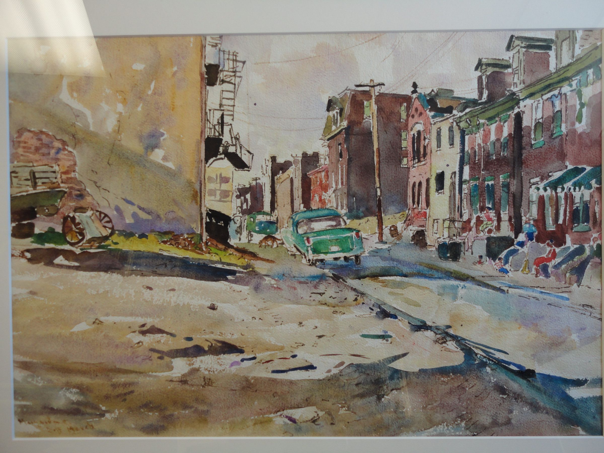 City, Street, Car, Buildings, Houses, Americana, Brown, Red, Green, Watercolor, Watercolor paper, Margret Ziff March, March, Watercolor
