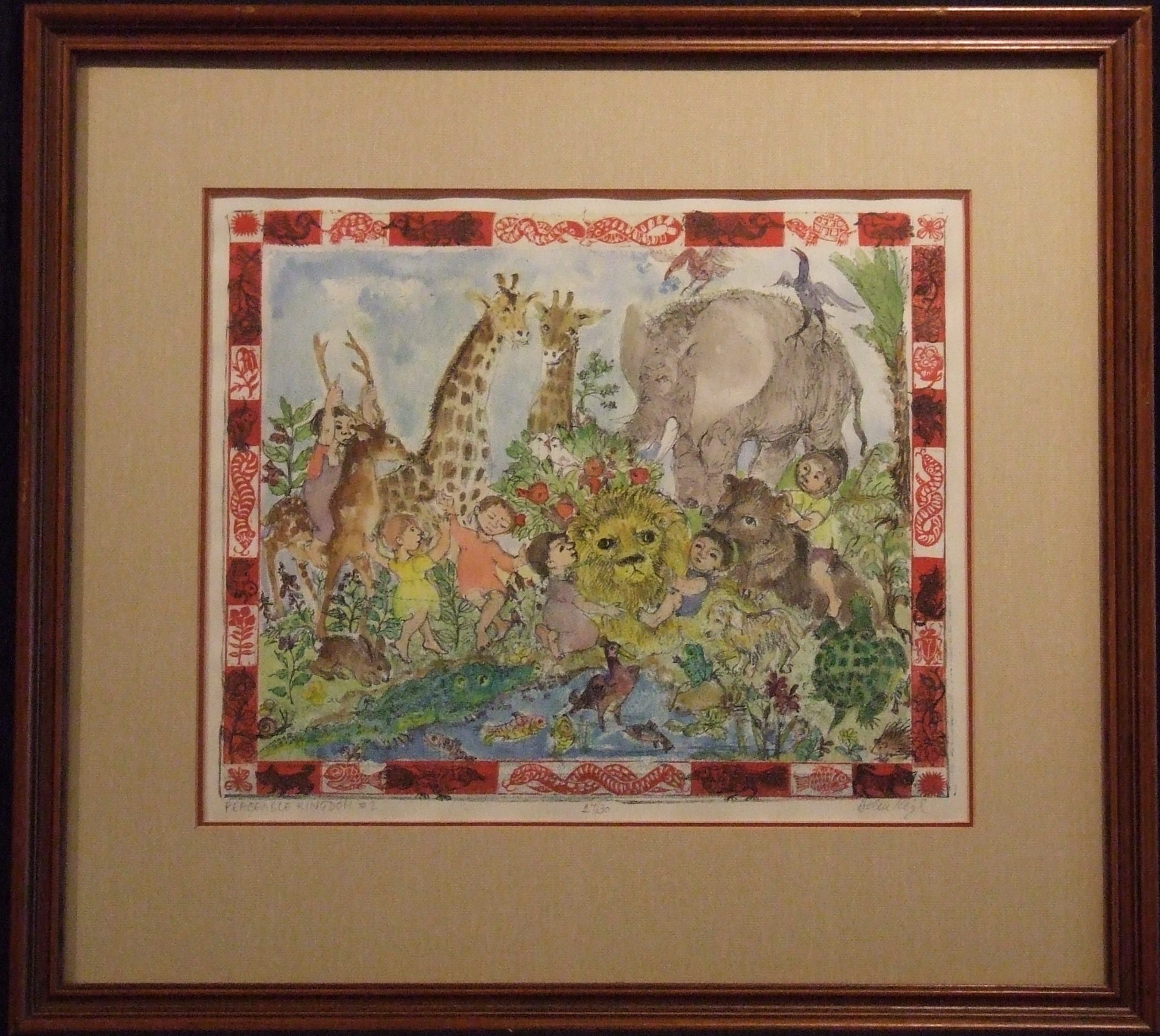 Print, Woodcut, Ink, Paper, Siegl, Helen, Helen Siegl, Siegl, Peaceable Kingdom, Children, Animals, Print, Woodcut, Ink, Paper