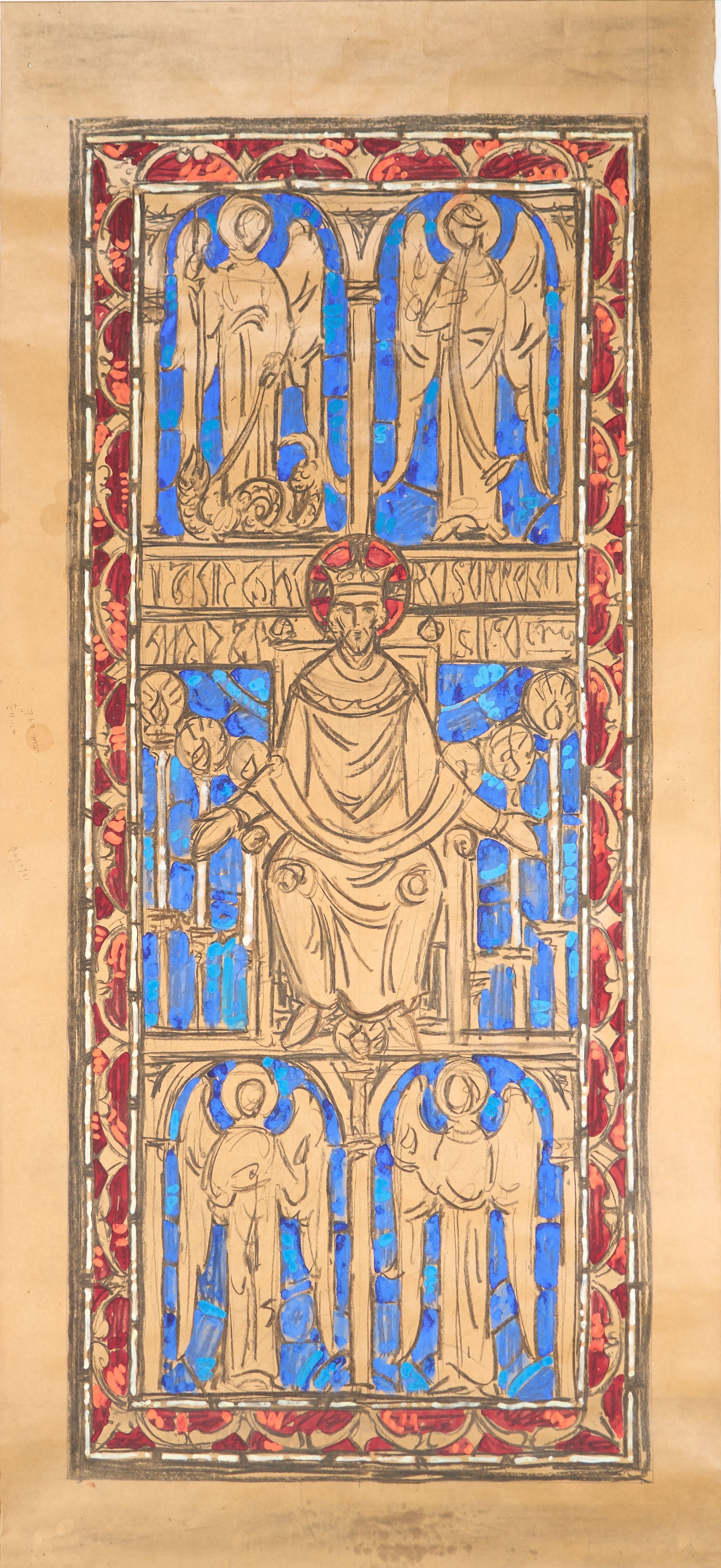 Stained glass scale drawing, window in the Mike Manella Mausoleum in Calvary Cemetery in Pittsburgh, Pennsylvania. This cartoon is colored in with gouache. The inscription reads "EGO SUM RESURRECTION ET VITA" ("I am the resurrection and the life"), John 11:25. Depicts Christ the King on a throne, with six candles and four archangels surrounding him. Archangels are, clockwise from top left: Michael, Gabriel, Uriel, Raphael.