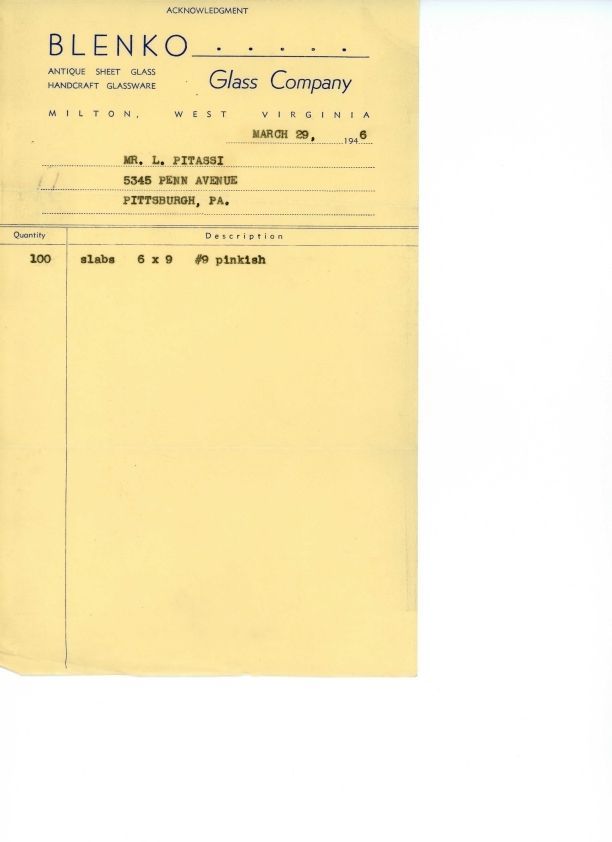 Receipt between Leo Pitassi and Blenko Glass Company for shipment of glass slabs.Collection