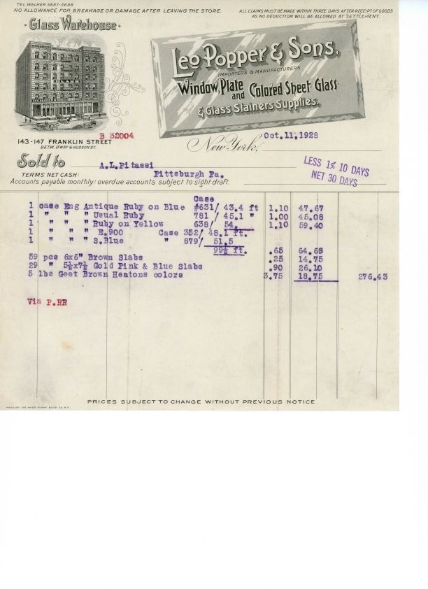 Receipt between Leo Pitassi and Leo Popper & Sons for $276.43 of glass slabs.Collection