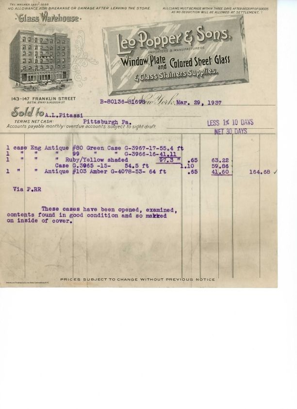 Receipt between Leo Pitassi and Leo Popper & Sons for $164.68 of glass slabs.Collection
