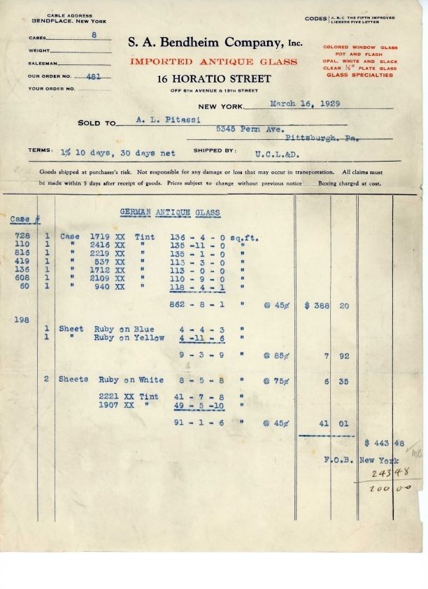 Receipt between Leo Pitassi and S. A. Bendheim for $443.48 of antique glass.Collection