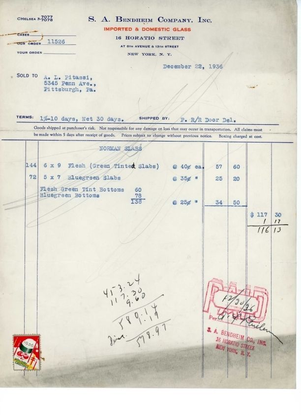 Receipt between Leo Pitassi and S. A. Bendheim company for $117.30 of Norman slab glass.Collection