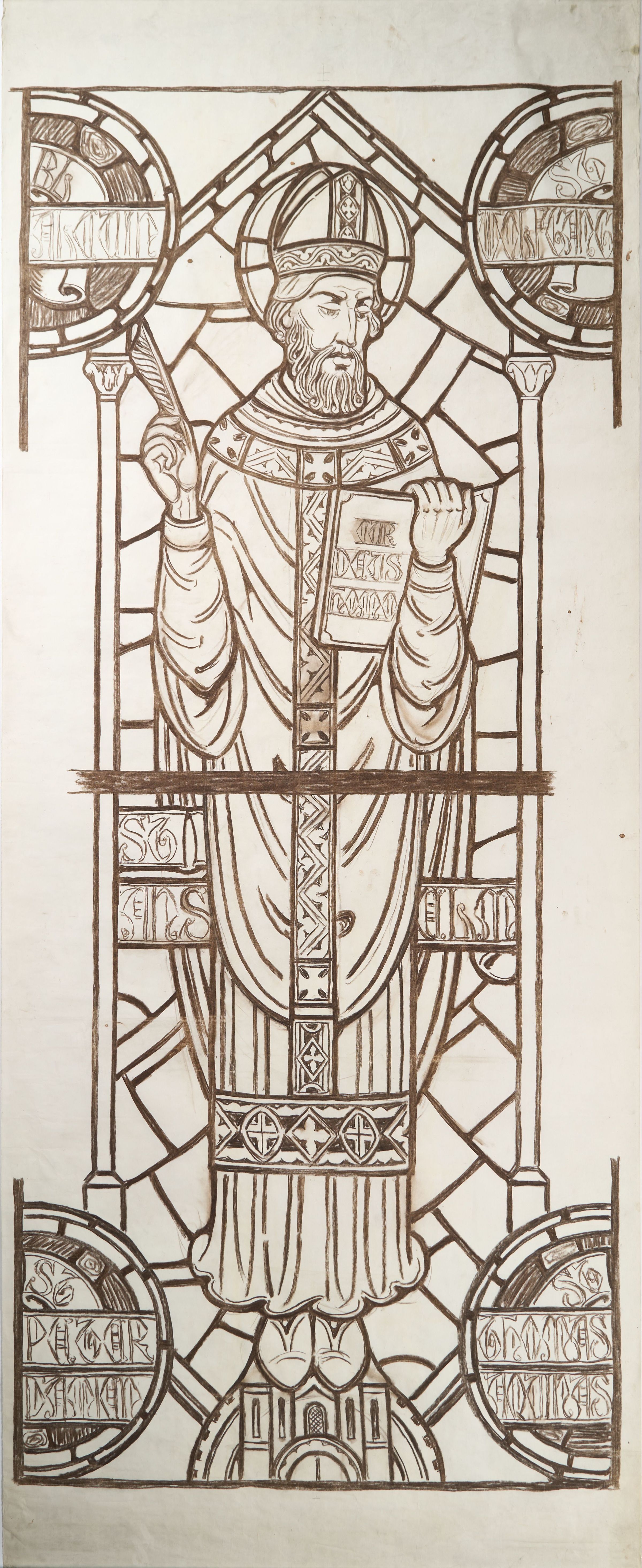 Stained glass scale cartoon for an aisle window at St. Benedict Catholic Church in Richmond, Virginia. Depicts St. Anselm holding a quill and a book that reads "CUR DEUS HOMO" ("Why Was God a Human?"). Around his image are the names of Bl. Alcuin, St. Wolfgang, St. Peter Damien, and St. Thomas Aquinas.Type of Drawing