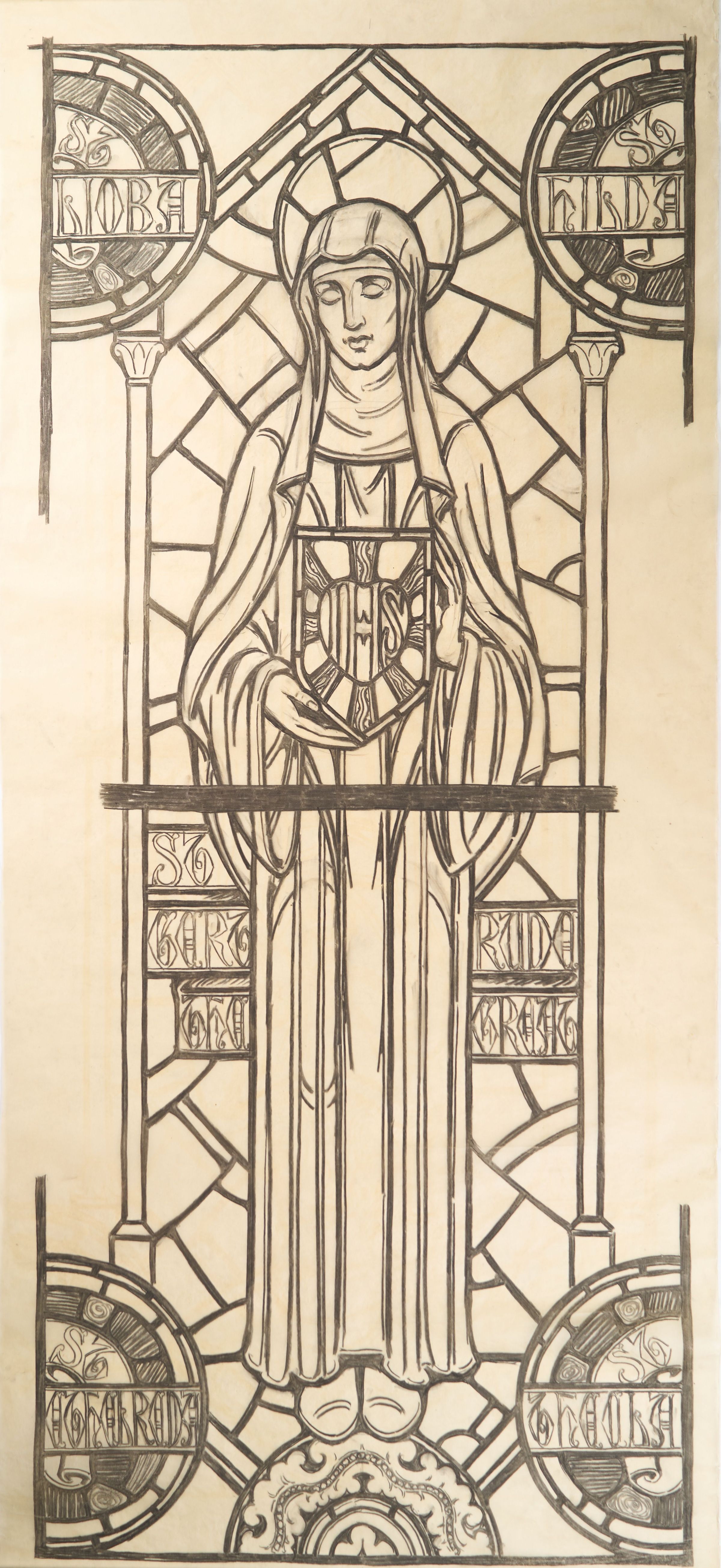 Stained glass scale cartoon for aisle window in St. Benedict Catholic Church in Richmond, Virginia. Depicts St. Gertrude the Great holding a shield that says "IHS" on it. Around her image are the names of St. Lioba, St. Hilda, St. Ethelreda, and St. TheclaType of Drawing