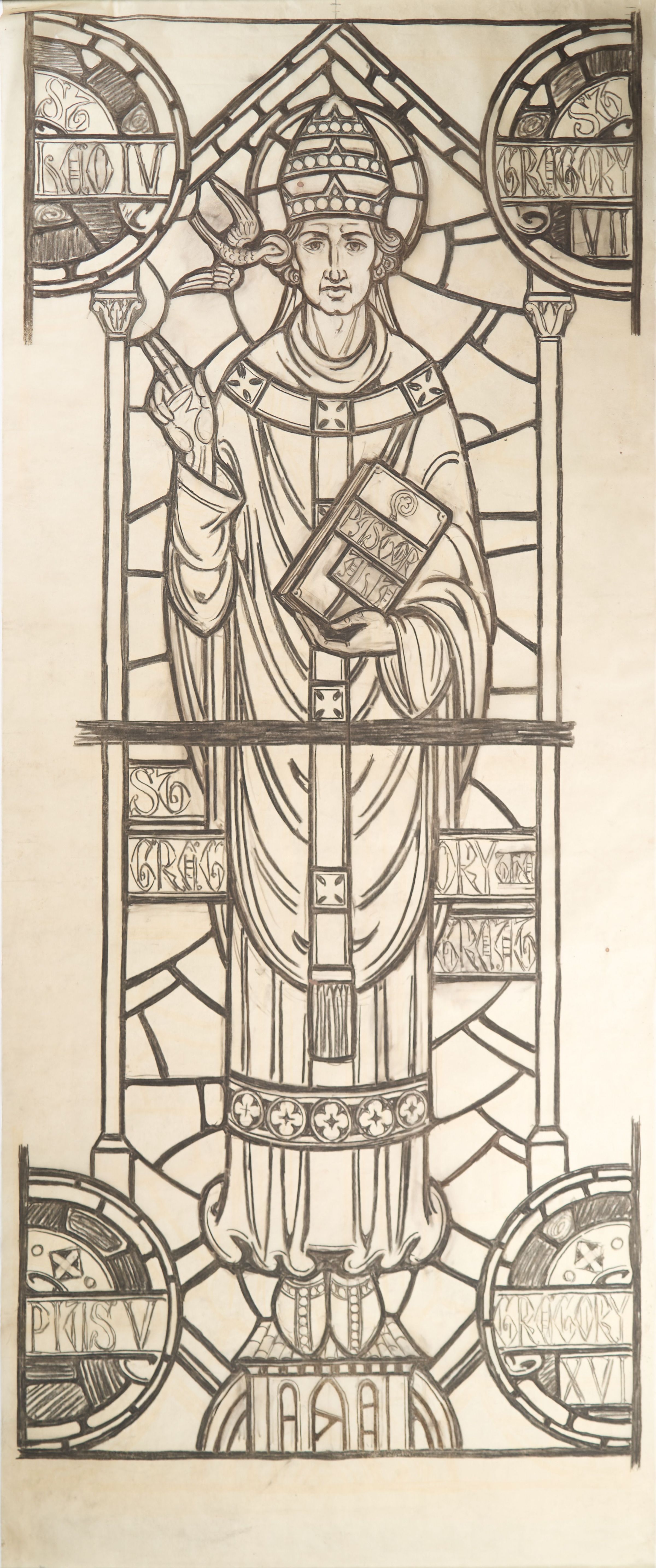 Stained glass scale cartoon for an aisle window at St. Benedict Catholic Church in Richmond, Virginia. Depicts St. Gregory the Great wearing the Papal Tiara. A dove flies near him and he holds a book that reads "PASTORALIA" ("pastoral care"). Around his image are the names of St. Leo IV, St. Gregory VIII, Pius V, and Gregory XVI.Type of Drawing