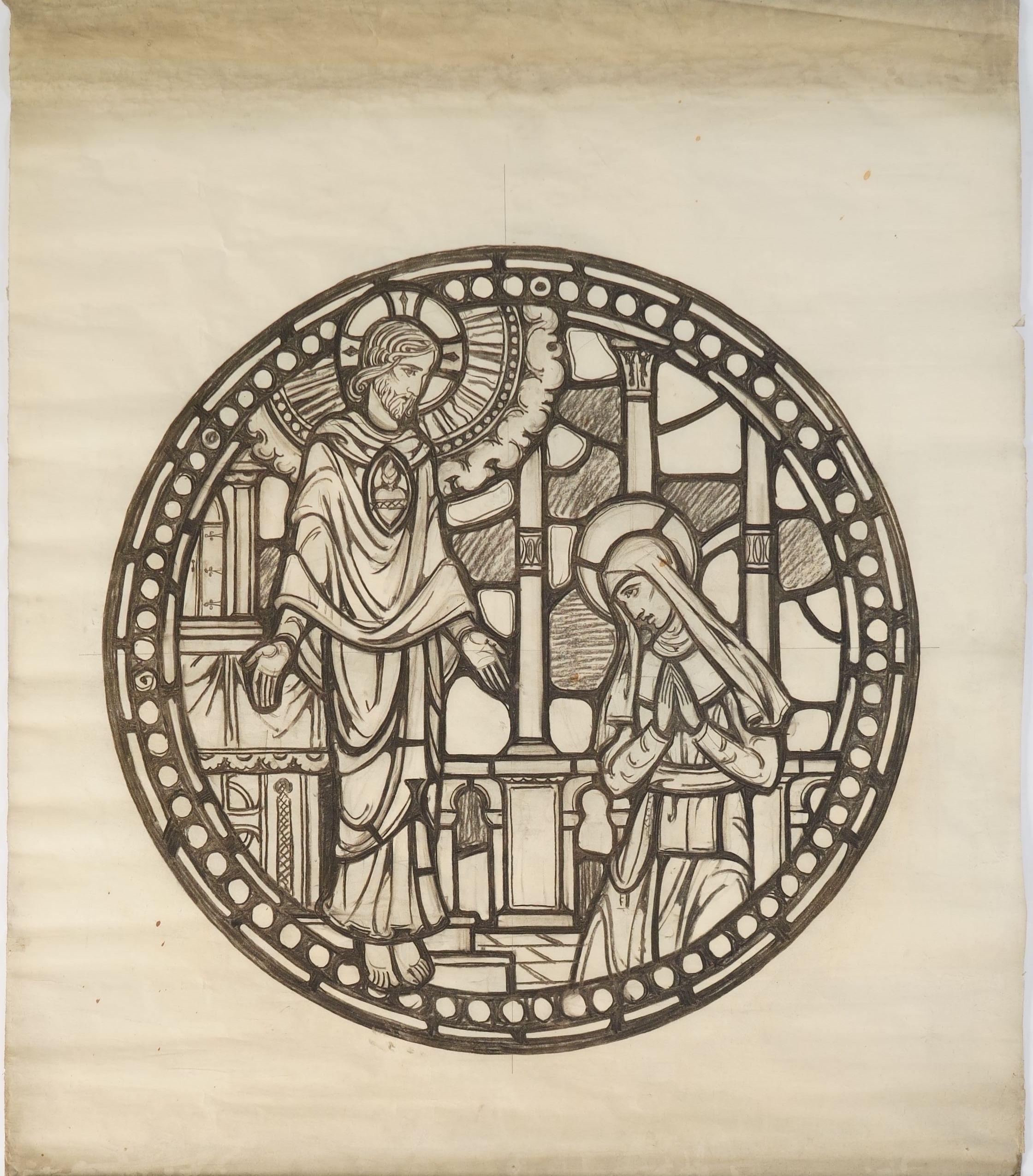 Stained Glass scale cartoon, Christ the King transept chapel in St. Benedict Catholic Church in Richmond, VA. Depicts Jesus appears before Saint Scholastica.