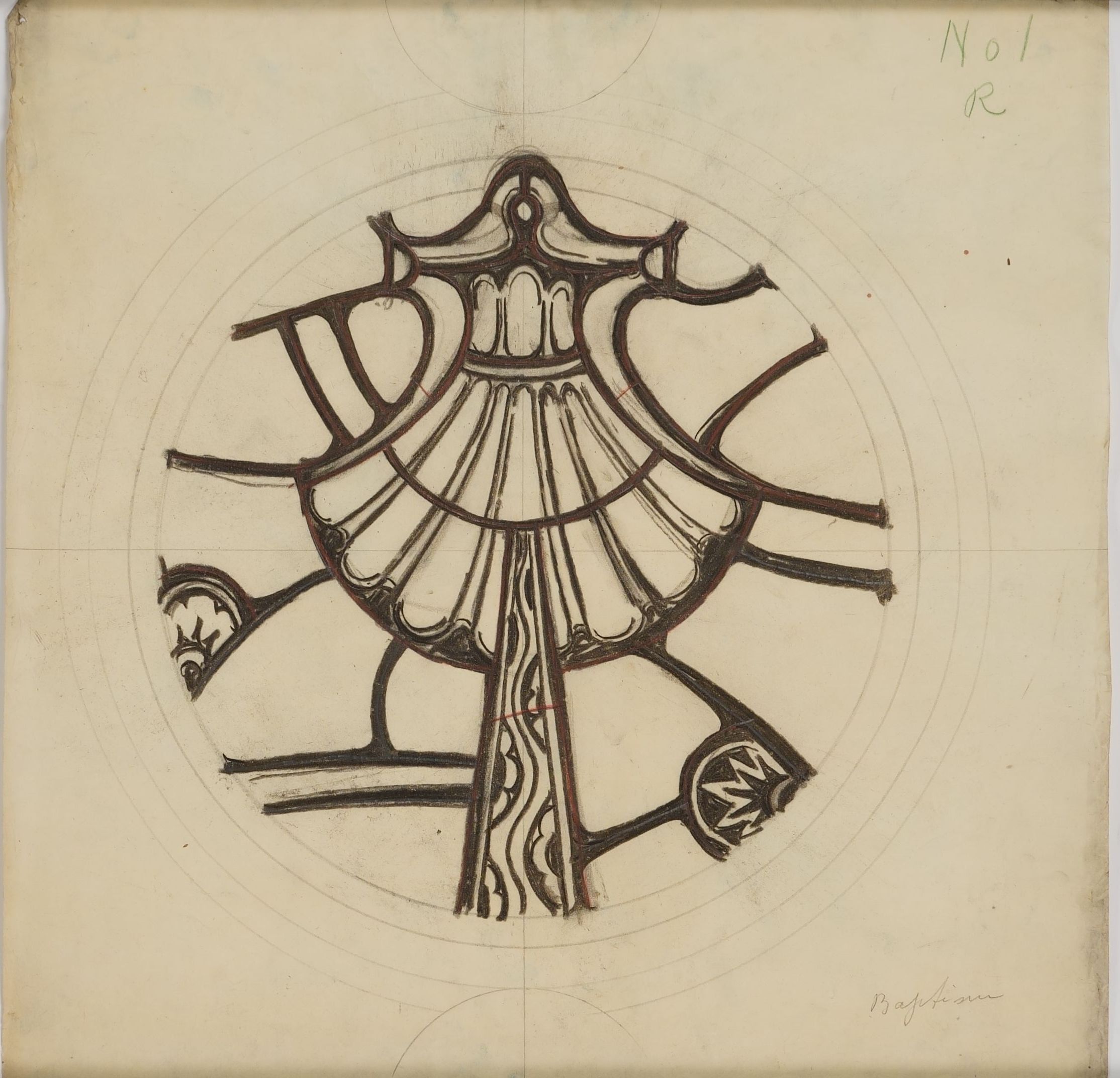 Stained glass scale drawing, St. Benedict's Church, Richmond, VA. Seven sacraments window medallion. This one depicts a shell representing Baptism.Type of Drawing