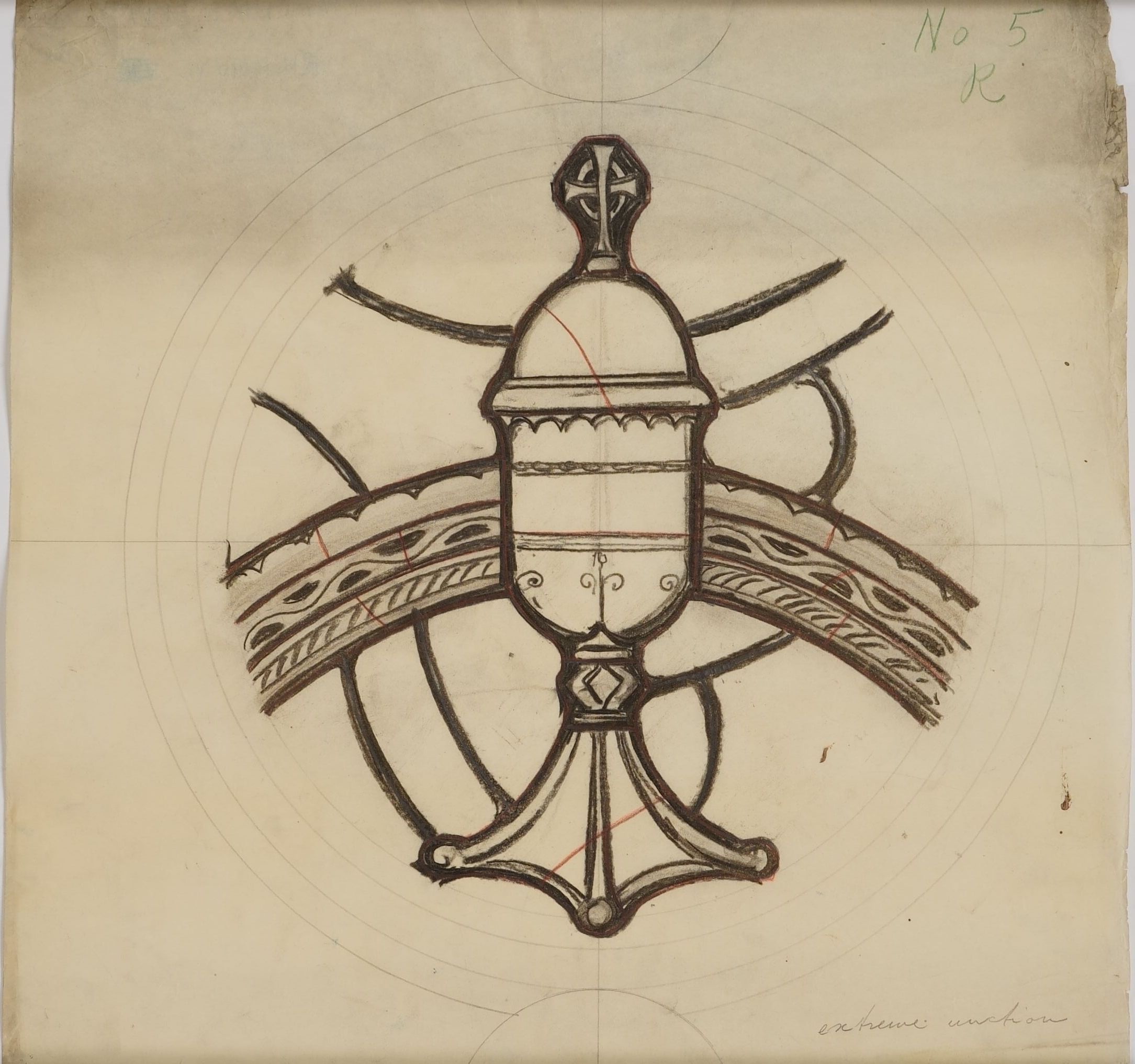 Stained glass scale drawing, St. Benedict's Church, Richmond, VA. Seven sacraments window medallion. This one depicts an oil of the sick chalice representing Extreme Unction/Anointing of the Sick.Type of Drawing