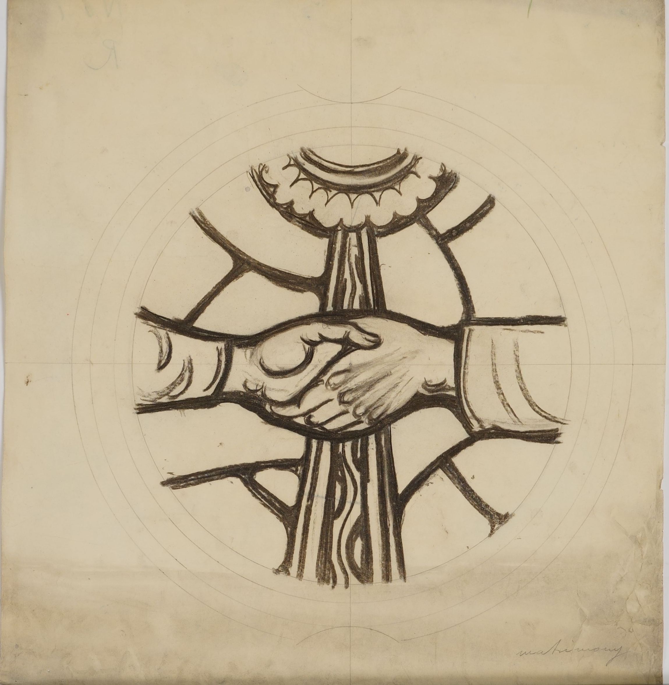 Stained glass scale drawing, St. Benedict's Church, Richmond, VA. Seven sacraments window medallion. This one depicts two clasped hands representing Matrimony.Type of Drawing