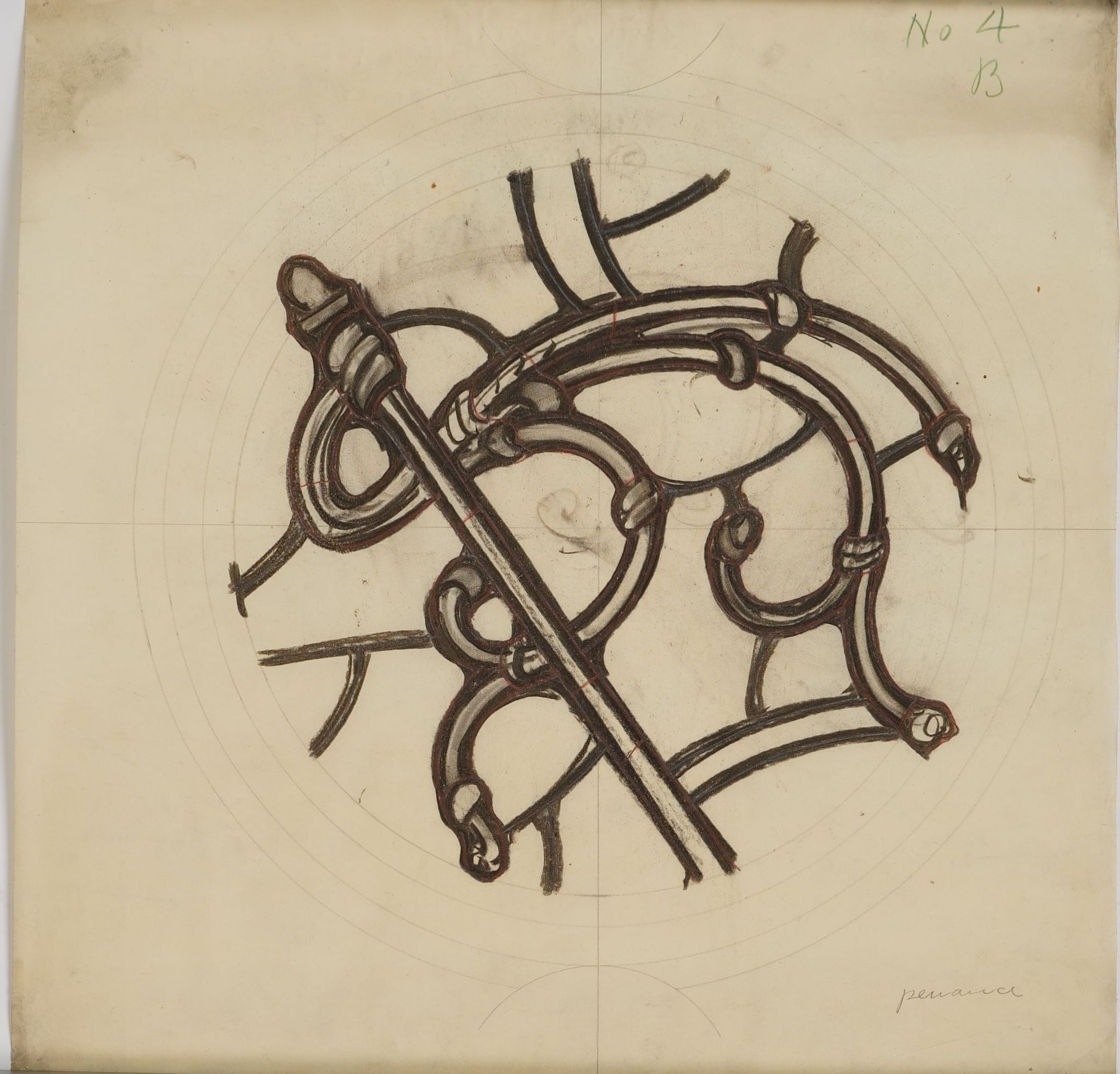 Stained glass scale drawing, St. Benedict's Church, Richmond, VA. Seven sacraments window medallion. This one depicts a whip representing penance.Type of Drawing
