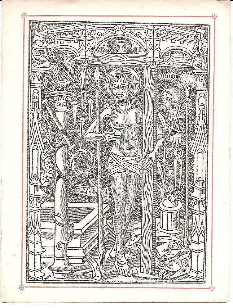 This is a reproduction of a 16th century engraving of Jesus risen from the dead surrounded by symbols of the Passion. Jesus is standing in the center clinging to his cross with his right arm and is holding a spear in his left. The rest of the engraving is encompassed by torture devices and other symbols of the Passion. This is 1 out of 4 of the same print.
