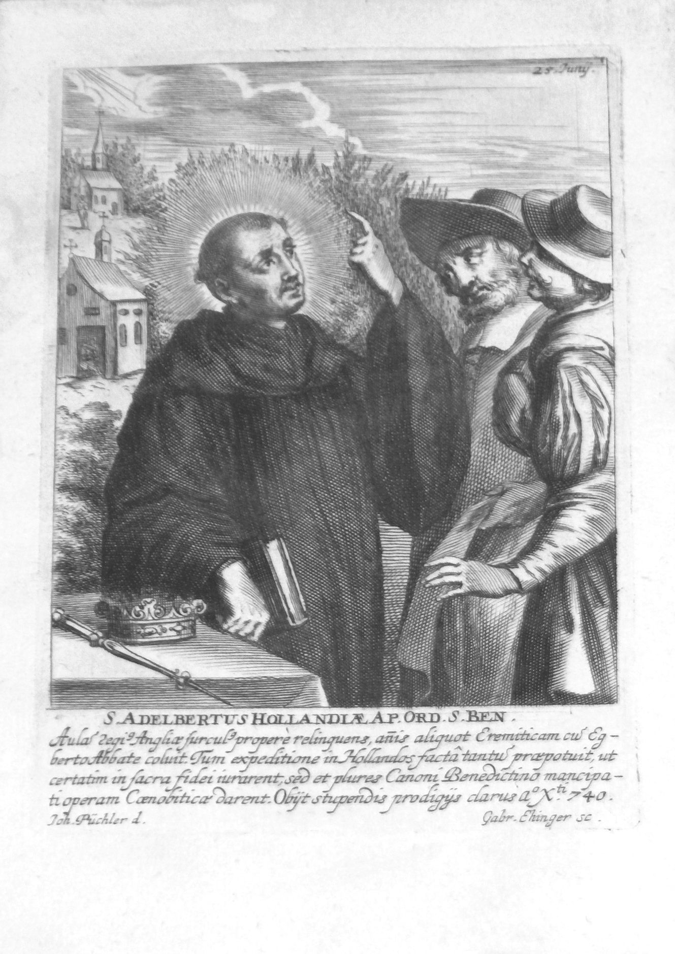 Engraving, Artwork, Ink, Saint Abelbert, Saint, Monk, Royal, Crown, Town, Church, sceptor, Engraving, Artwork, Ink