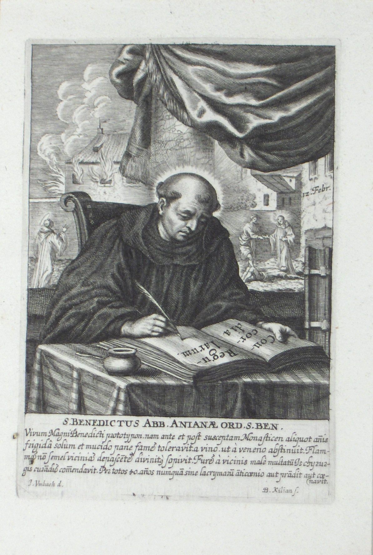 Engraving, Artwork, Ink, Saint Benedict, Saint, Monk, Abbot, Montecassino, Regula, Rule, Book, Write, Aniana, Fire, Engraving, Artwork, Ink