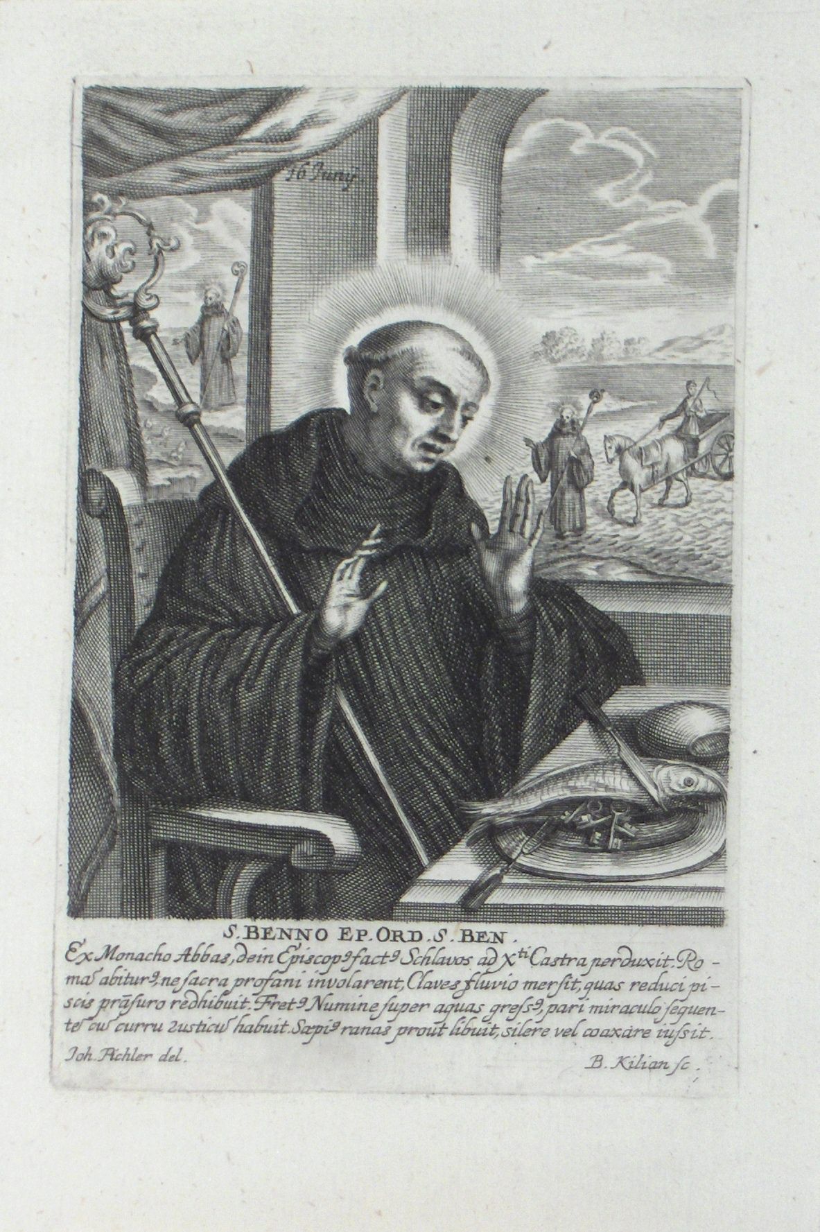 Engraving, Artwork, Ink, Saint Benno, Saint, Monk, Bishop of Meissen, Staff, Fish, Keys, Knife, Table, Engraving, Artwork, Ink