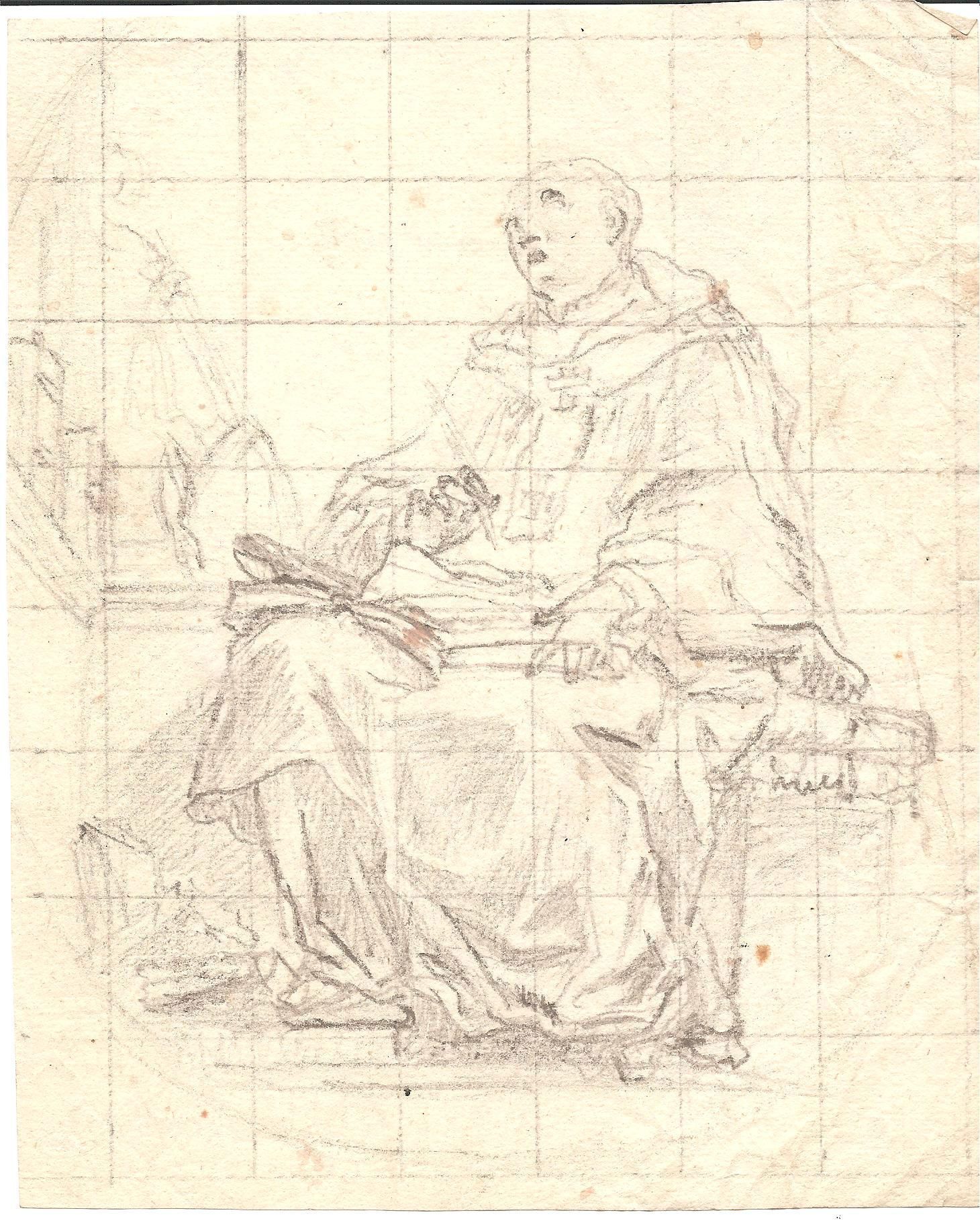 In this sketch he is shown writing in a book with the emblems of the office of bishop nearby (the mitre and crozier), and the pallium of an archbishop worn over his Benedictine habit.Artwork Details