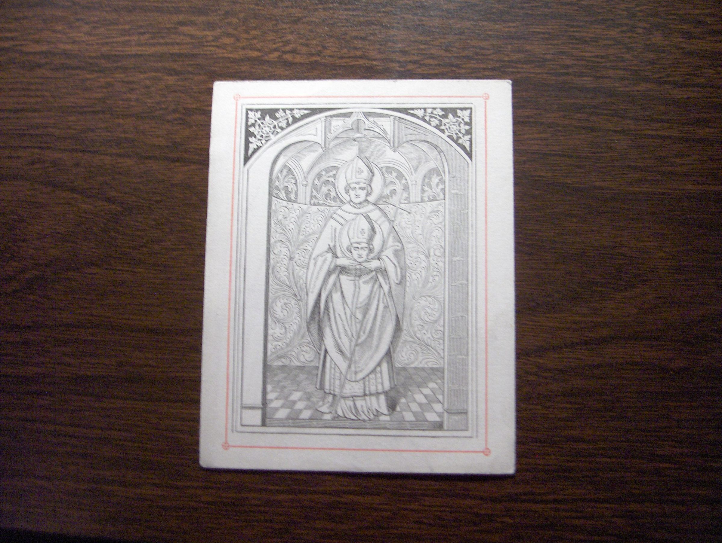 This is a reproduction of a 16th century engraving of Saint Denis of Paris. He is dressed in Bishop clothes holding his own head. He was Bishop of Paris and was martyred by beheading in approximately A.D. 250. Also known as the patron saint of Paris.They are also both holding books. This is 2 out of 2 of the same print.