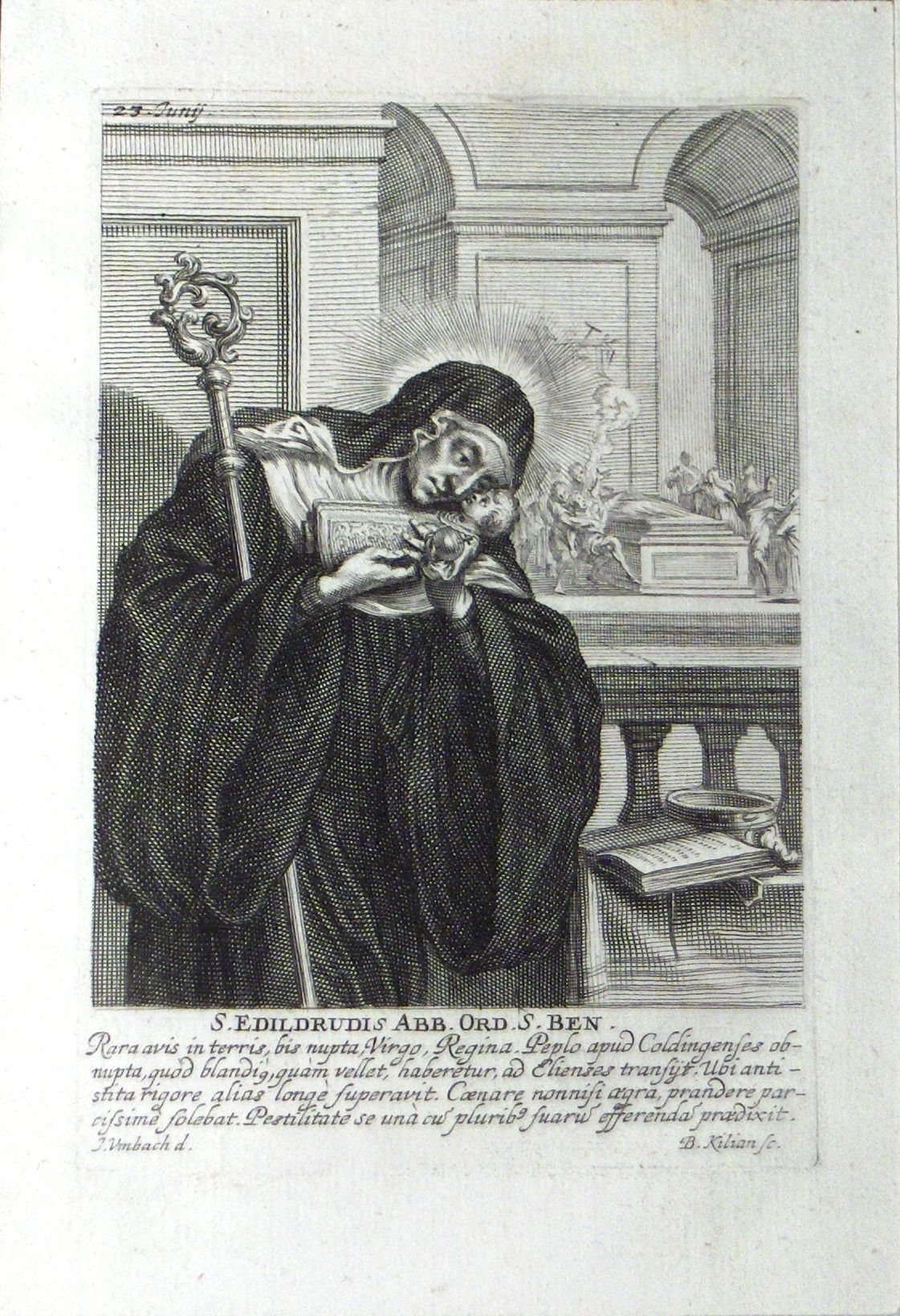 Engraving, Artwork, Ink, Saint Edildrudis, Midwife, Baby, Child, Nun, Abbess, Mourning, Death, Saint, Engraving, Artwork, Ink