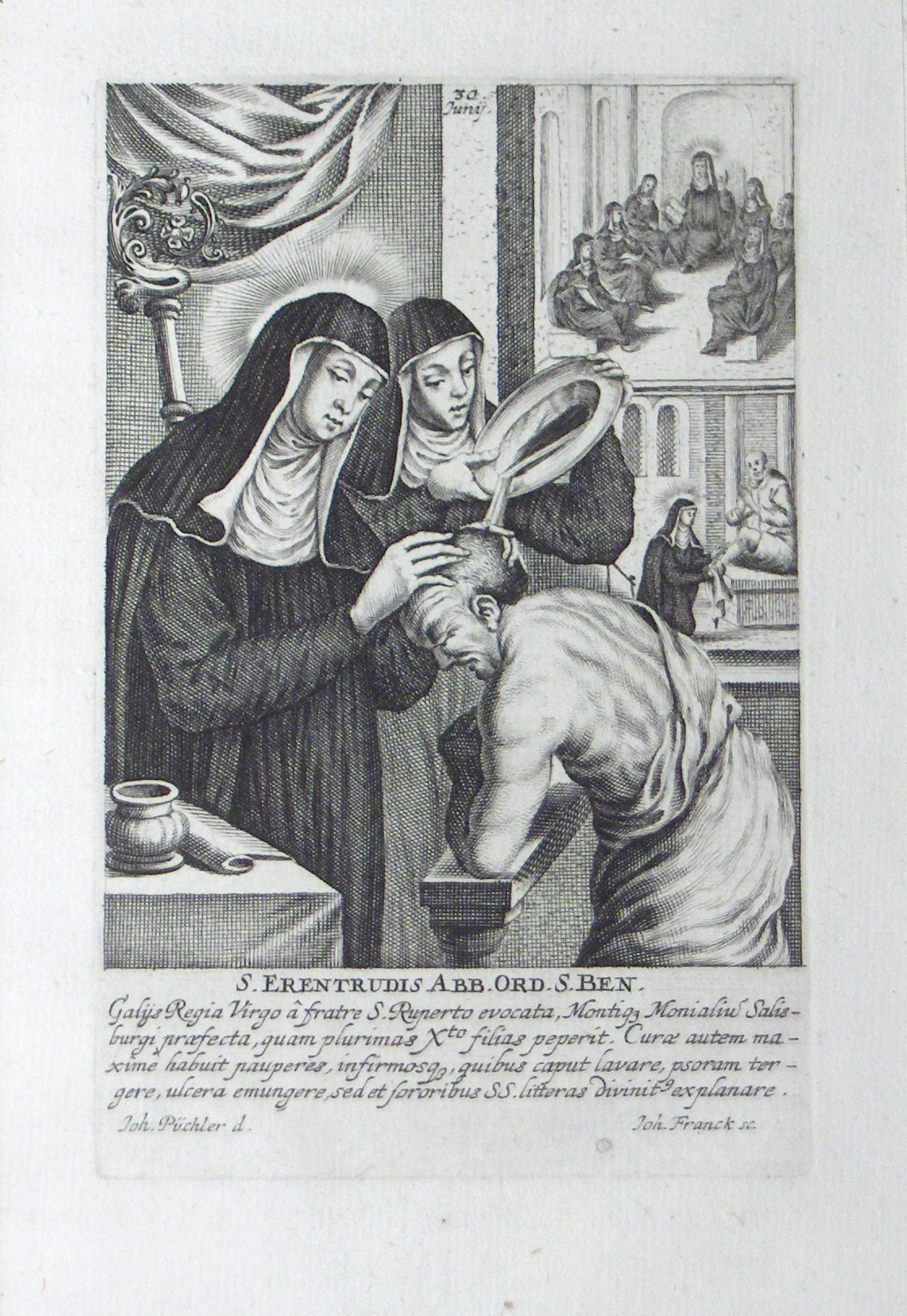 Engraving, Artwork, Ink, Saint Erentruda, Saint, Nun, Water, Baptize, Abbess, Saint Rupert of Salzburg, Nonnberg Monastery, Germany, Lepers, Engraving, Artwork, Ink