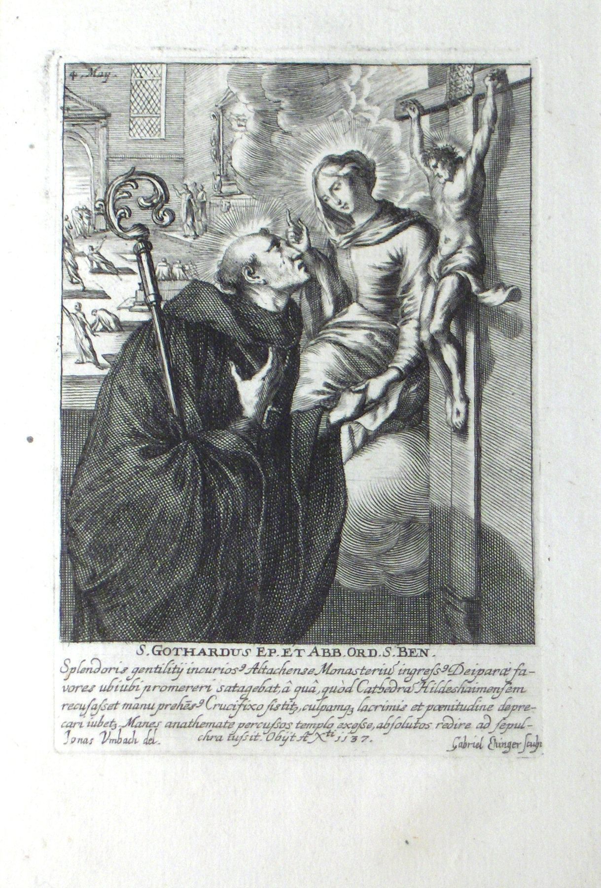 Engraving, Artwork, Ink, Saint Gothard, Saint, Monk, Tears, Crucifix, Jesus, Abbot, Staff, Virgin, Mary, Mother, Engraving, Artwork, Ink