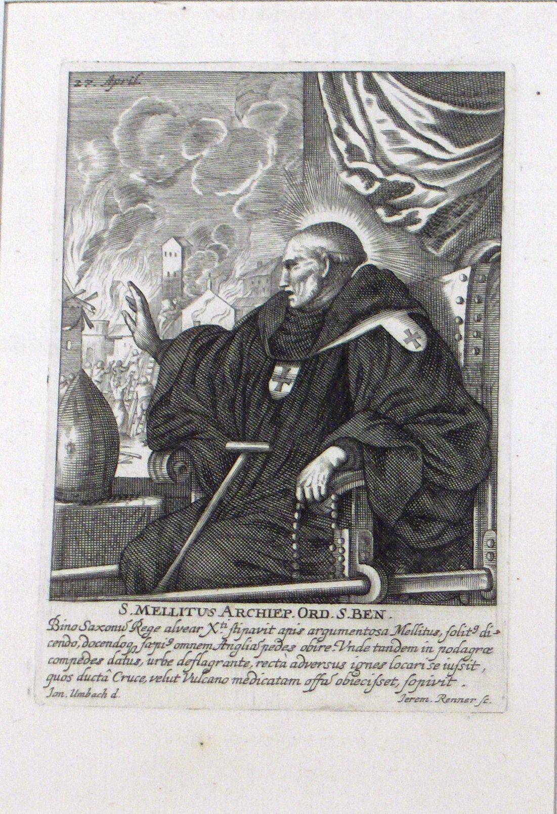 Engraving, Artwork, Ink, Archbishop of Canterbury, Saint Mellitus, Saint, Monk, Archbishop, Fire, Burn, Crutch, Engraving, Artwork, Ink