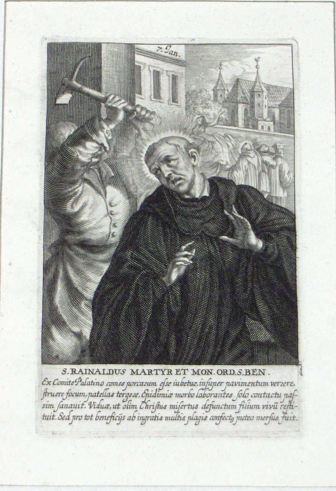 Engraving, Artwork, Ink, Saint Rainaldus, Martyr, Pick axe, Monk, Saint, Murder, Engraving, Artwork, Ink
