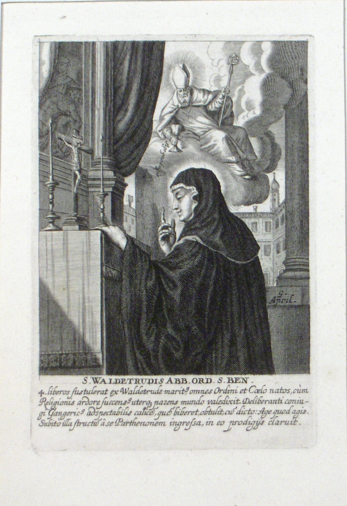 Engraving, Artwork, Ink, Saint Waldetrudis, Waltrude, Waudru, Wife of Saint Vincent Madelgar, Pray, Nun, Saint, Alter, Crucifix, Engraving, Artwork, Ink