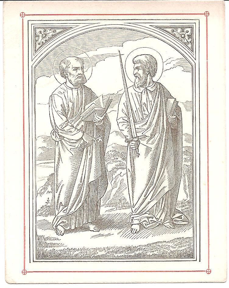 This is a reproduction of a 16th century engraving of Saints Peter and Paul standing next to each other. Paul is carrying a sword, in which he was martyred with, and Peter is holding the keys to heaven, which are a sign of his primacy over the Church. They are also both holding books. This is 1 out of 7 of the same print.
