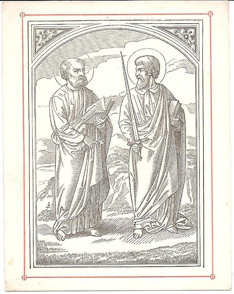This is a reproduction of a 16th century engraving of Saints Peter and Paul standing next to each other. Paul is carrying a sword, in which he was martyred with, and Peter is holding the keys to heaven, which are a sign of his primacy over the Church. They are also both holding books. This is 7 out of 7 of the same print.