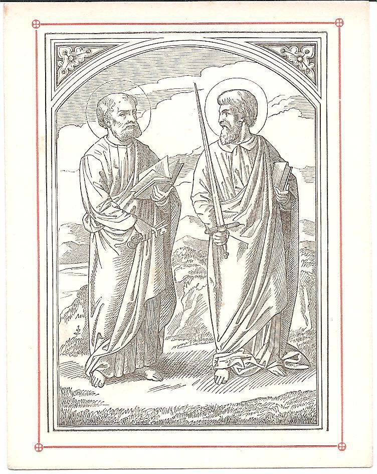 This is a reproduction of a 16th century engraving of Saints Peter and Paul standing next to each other. Paul is carrying a sword, in which he was martyred with, and Peter is holding the keys to heaven, which are a sign of his primacy over the Church. They are also both holding books. This is 5 out of 7 of the same print.