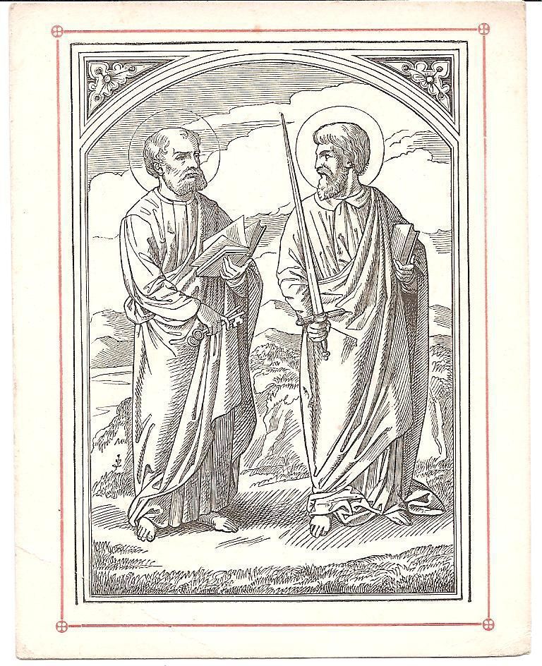 This is a reproduction of a 16th century engraving of Saints Peter and Paul standing next to each other. Paul is carrying a sword, in which he was martyred with, and Peter is holding the keys to heaven, which are a sign of his primacy over the Church. They are also both holding books. This is 3 out of 7 of the same print.