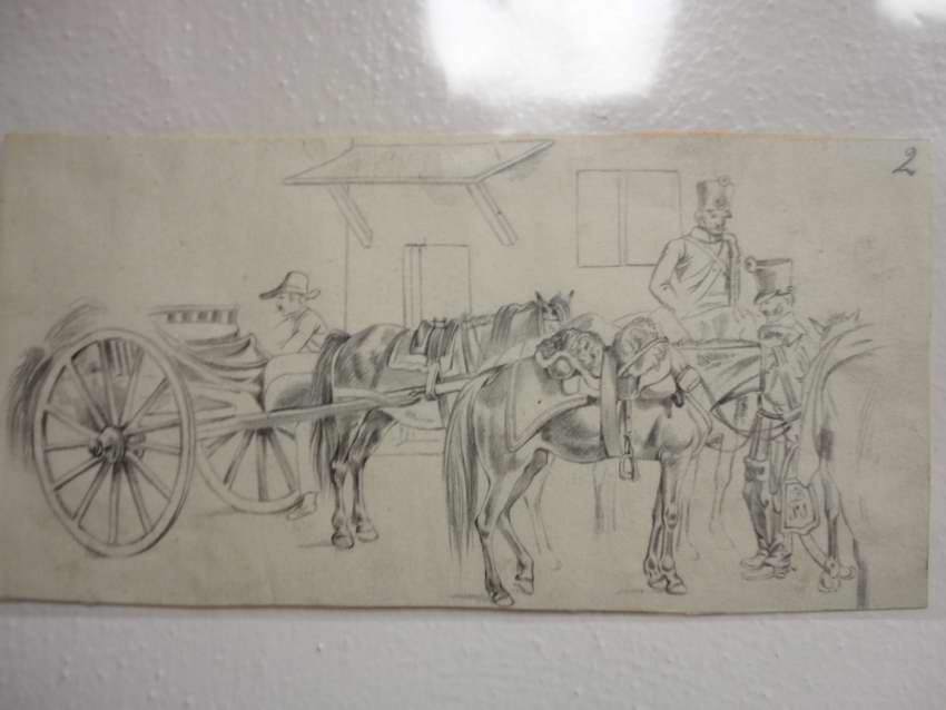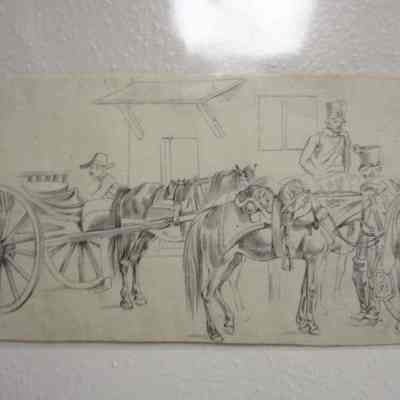 This piece depicts a group of horses and a buggy. It is most likely a study for a painting.Collection