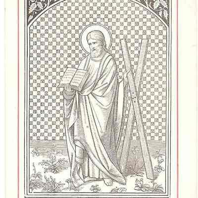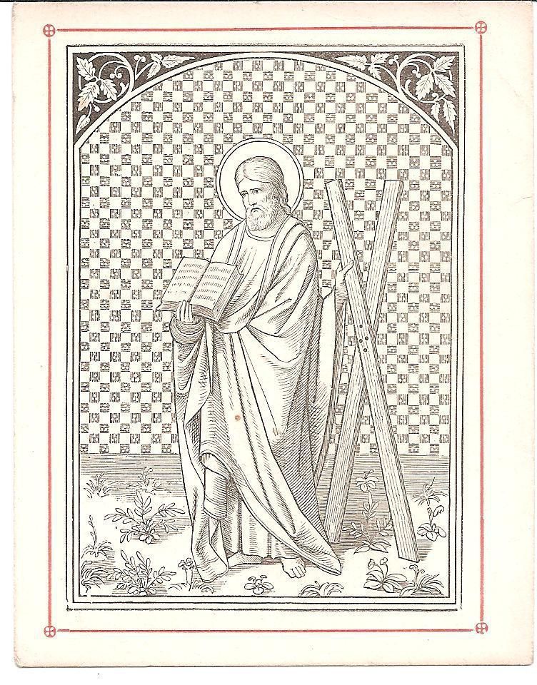 This is a reproduction of a 16th century engraving of St. Andrew holding an open book and the cross on which he was crucified on. He was a fisherman and later became the first disciple of Jesus. Unlike Jesus' cross, Andrew's cross was in the shape of an X (Crux decussata) and he was tied not nailed to it. . This is 3 out of 5 of the same print.