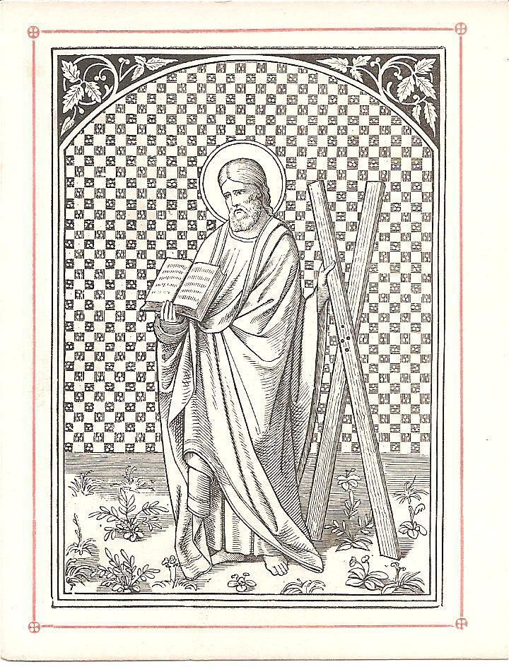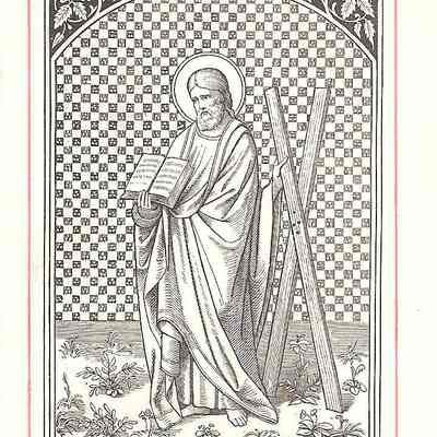 This is a reproduction of a 16th century engraving of St. Andrew holding an open book and the cross on which he was crucified on. He was a fisherman and later became the first disciple of Jesus. Unlike Jesus' cross, Andrew's cross was in the shape of an X (Crux decussata) and he was tied not nailed to it. . This is 5 out of 5 of the same print.