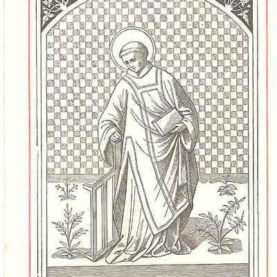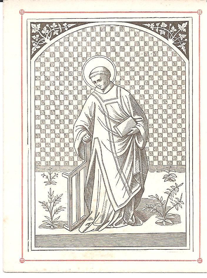 This is a reproduction of a 16th century engraving of Saint Lawrence of Rome. He was one of the seven deacons of ancient Rome who were martyred during the persecution of Valerian in 258. He was put to death on a gridiron. Saint Lawrence is in the center holding a book in his left hand and looking down at his right hand which is holding a gridiron. He is also dressed in deacon attire. This is 3 out of 3 of the same print.