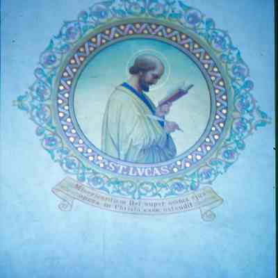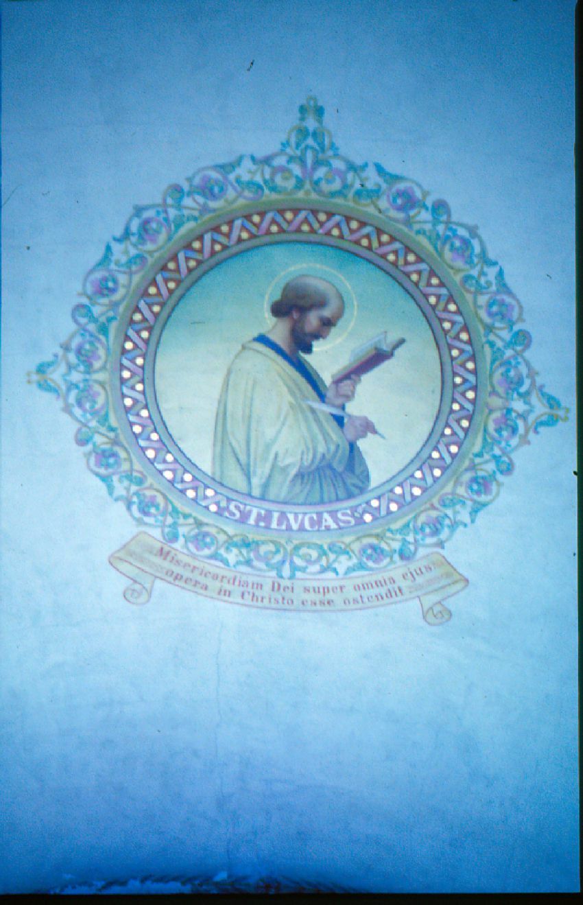 This false fresco depicts St. Lucas reading and writing. The inscription reads: "Misericordiam Dei super omnia ejus opera in Christo case ostendit."